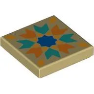 3068bpb2562c2 - LEGO világos krémszínű (tan) csempe 2 x 2 méretű, kék csillag és sötét türkiz és narancssárga nyilak mintával