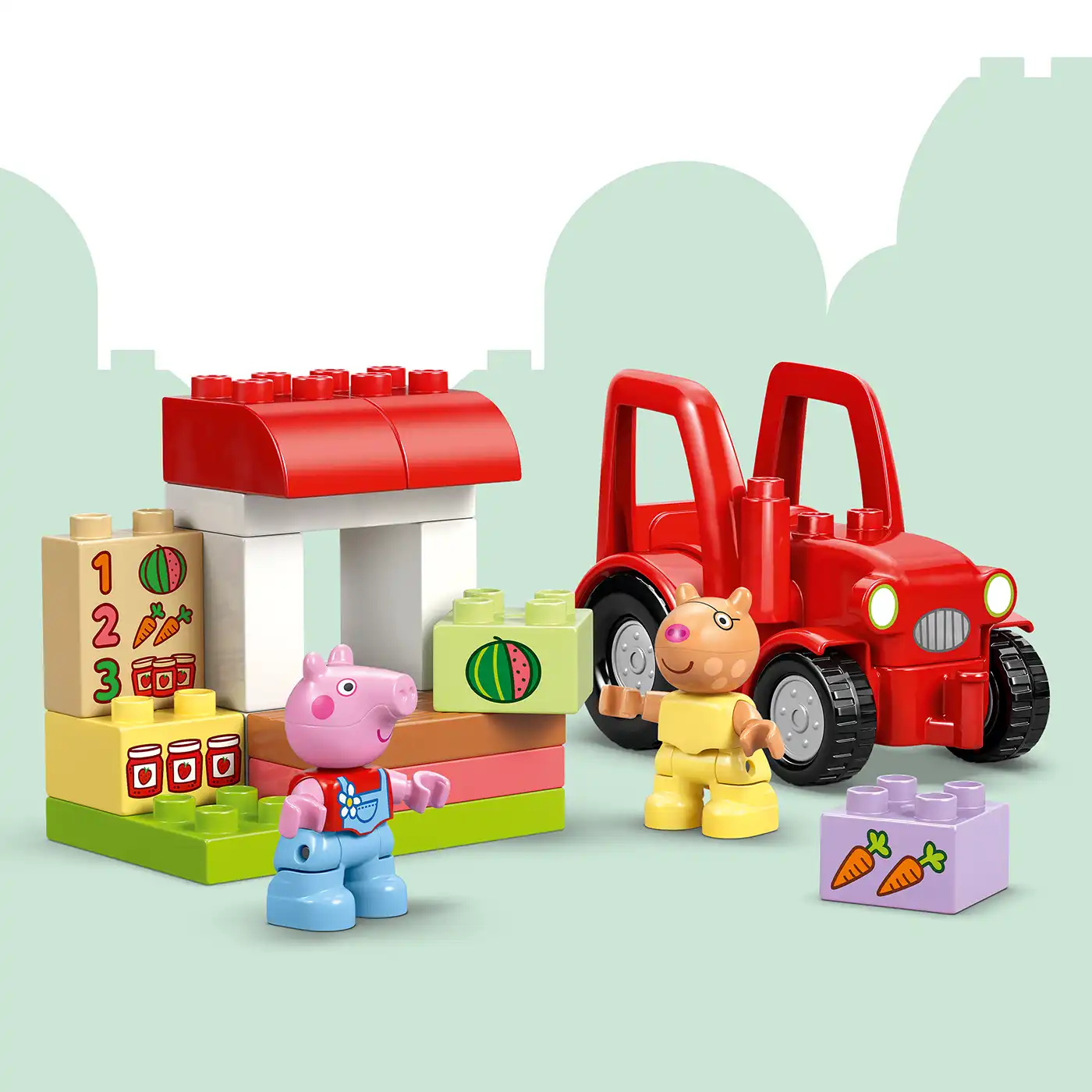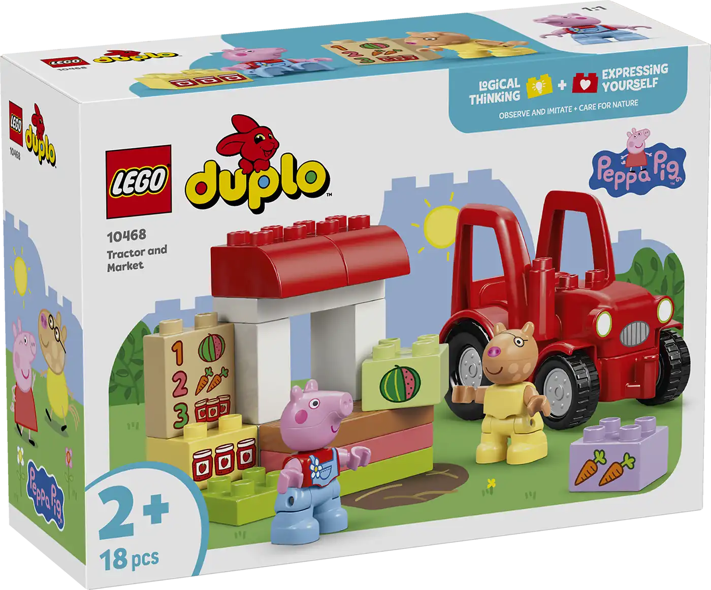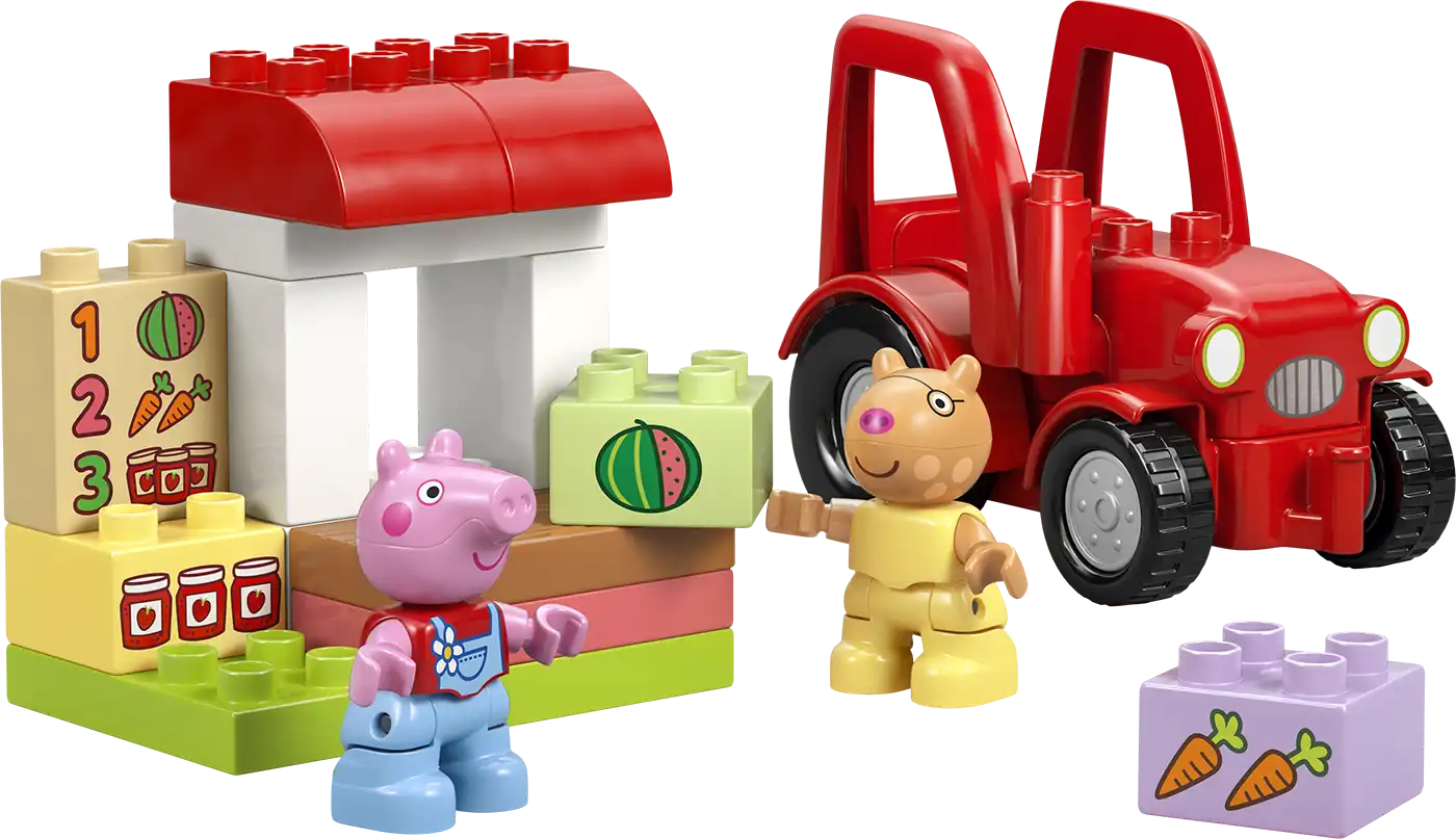 Segítsd a kisgyerekeket kreativitásuk fejlesztésében a Peppa malac Traktor és piac (10468) építőjátékkal! A 2 éves és idősebb kisgyerekek elmerülhetnek a fantáziadús játékban, amikor játékból a farm kisboltját vezetik, és azt LEGO® DUPLO® építőelemekkel töltik meg, amelyeket eladható élelmiszerekkel díszítenek. A fantáziadús játék Pedro póni és Peppa malac figurákkal, egy vezethető piros traktorral, valamint sárgarépa, görögdinnye és lekvárosüveg kockákkal érkezik. Ez a kisgyerekeknek készült oktatójáték rengeteg fejlődési lehetőséget kínál. A sorozat jeleneteinek megfigyelésével és utánozásával javíthatják kognitív képességeiket, például a problémamegoldási készségeiket és a memóriájukat. A kis építők finommotoros képességeiket használják a traktor és az istálló megépítéséhez. A készletben egy görögdinnyével, sárgarépával és lekváros üvegekkel díszített menü található. A kisgyerekek gyakorolják a számok felismerését és párosítását, miközben megtalálják a megfelelően díszített elemeket. A készlet 18 elemet tartalmaz.