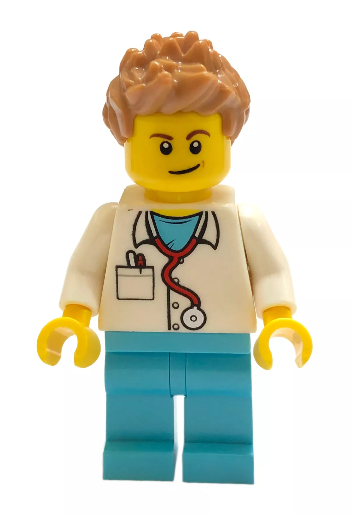 LEGO Minifigurák cty899 - LEGO City doktor minifigura, közepes azúr lábak, sztetoszkóp, tüskés haj