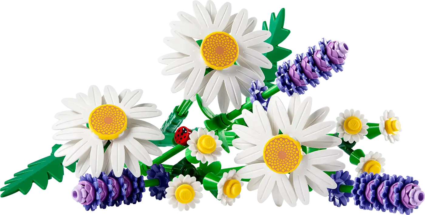 A lányok és fiúk nagy örömmel fogják elkészíteni ezt a szép csokrot, amely 3 nagy százszorszépet, 2 kis százszorszépszárat, 3 nyugtató levendulát és élénkzöld szárakat tartalmaz. A vidámság és a nyugalom tökéletes egyensúlyát kínáló apró LEGO csokor rendkívül valósághű virágokat és egy imádnivaló szerencse-katicabogarat tartalmaz az egyik levendulaszáron. Ez egy olyan aranyos kiegészítő, amely biztosan örömet szerez a fiatal építőknek. Miután elkészült, a gyerekek büszkén mutathatják meg LEGO virágcsokrukat, amely esztétikus hálószoba- vagy íróasztaldíszként soha nem hervad el, és öntözni sem kell.