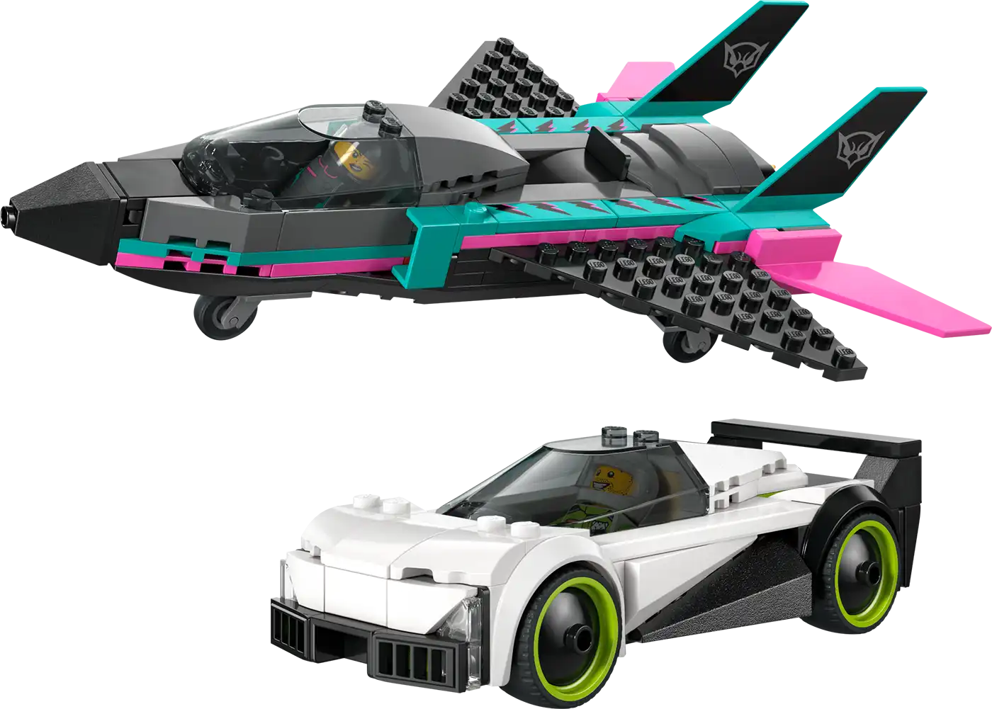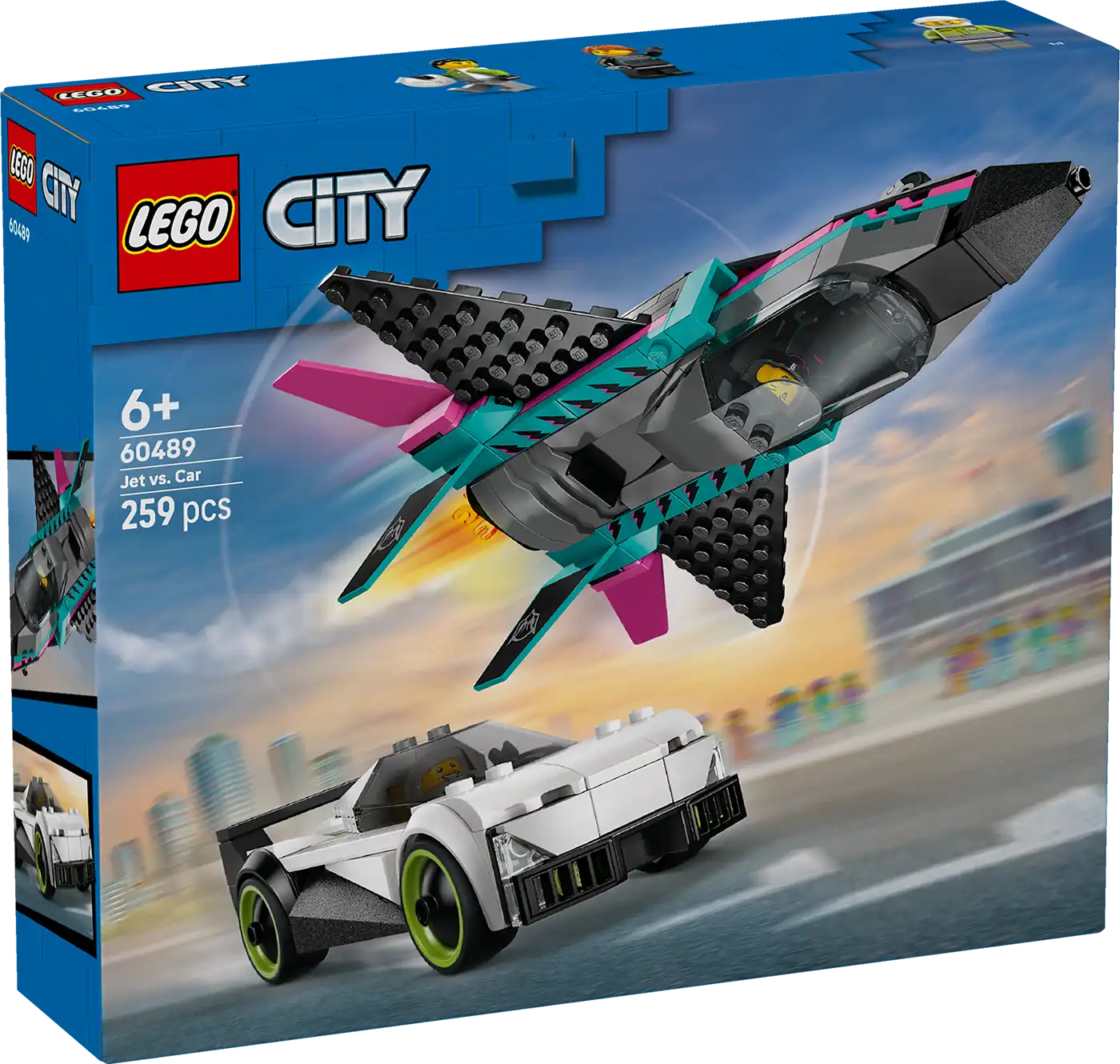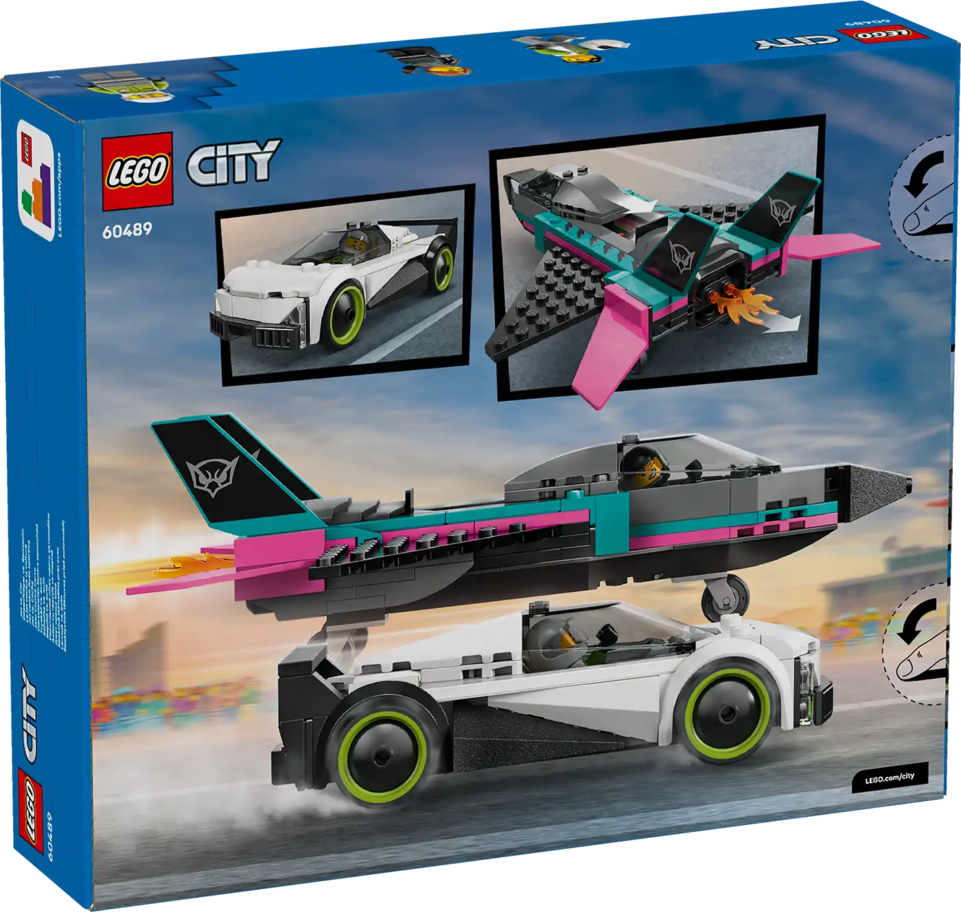 Ez a kettős LEGO® City Repülő vs. autó (60489) járműjáték-készlet egy karcsú szuperautót és egy szuperszonikus repülőgépet tartalmaz a fantáziadús versenyekért. A játék repülőgép hátsó szárnyakkal, függőleges ikeruszonyokkal és stabilizátorokkal rendelkezik. A gyerekek egy kart elmozdítva bekapcsolhatják a sugárhajtású repülőgép utánégetőit, és kinyithatják a szuperautó pilótafülkéjét, hogy megnézhessék a részletesen kidolgozott belső teret, amelyben versenyzőülés is található. Egyszerűen csak add hozzá a pilóta és a versenyző minifigurákat, és órákon át élvezheted a látványos versenyeket.