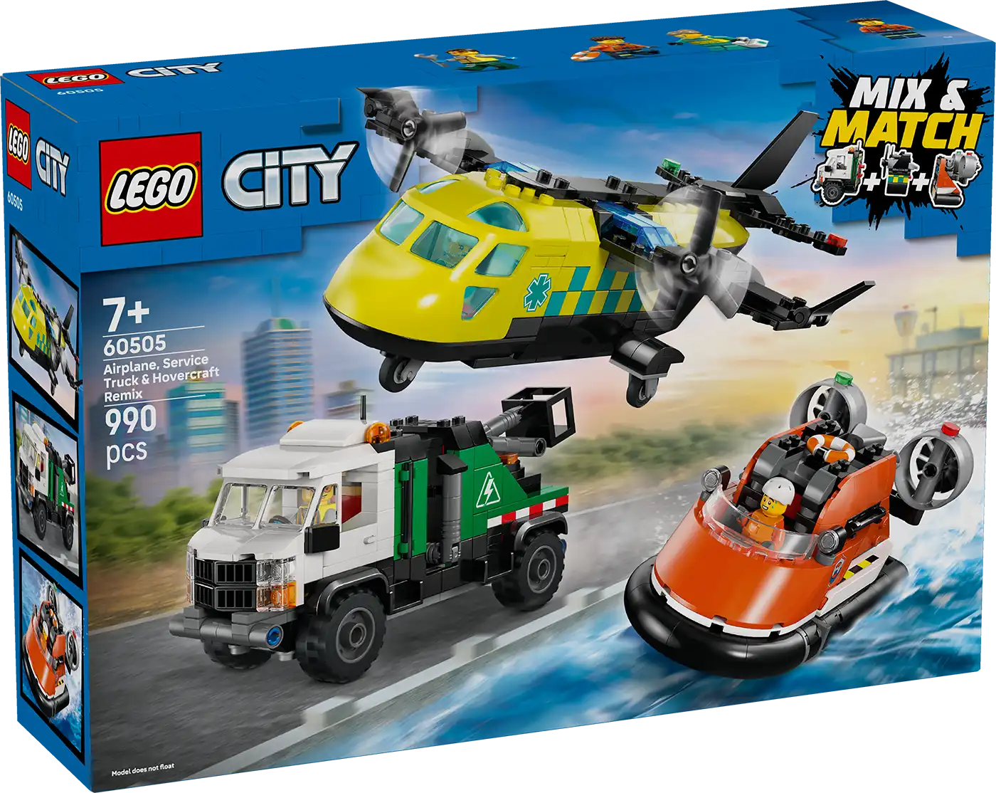 Ösztönözd a kreatív játékot a 7 éves kortól ajánlott LEGO® City Repülőgép, emelőkosaras kocsi és légpárnás jármű remix (60505) készlettel! Ez a 3 modellből álló mentőjárműves játéképítő-készlet egy mentőrepülőgépet, egy parti őrség légpárnás járművét és egy emelőkosaras teherautót tartalmaz. Minden modell 3 moduláris részből áll, amelyek kombinálhatók, így a fiúk és lányok variálhatják és összepárosíthatják saját akciójárműveiket a szórakoztató küldetésekhez. Egyszerűen csak add hozzá a sofőr, a parti őr és az orvos minifigurákat, és máris kezdődhet a kaland!