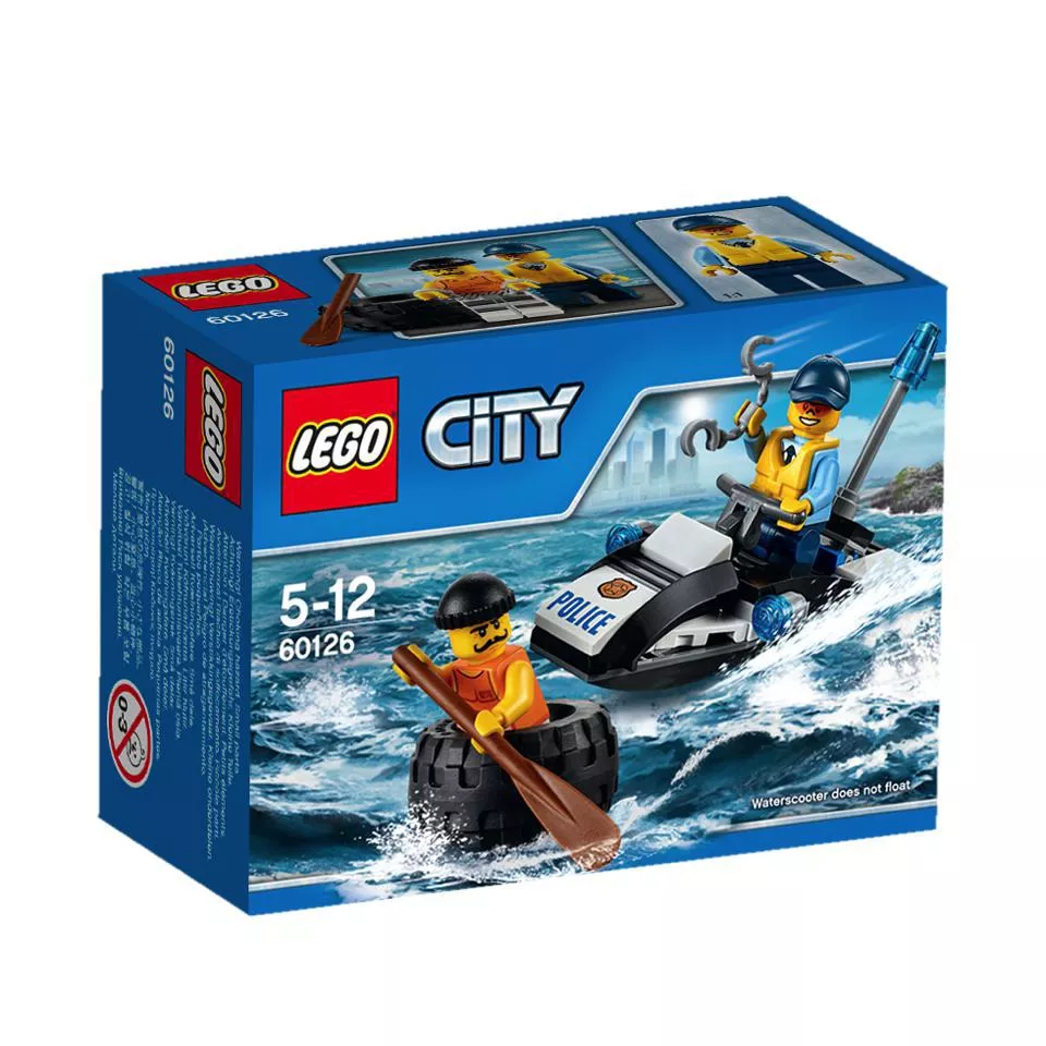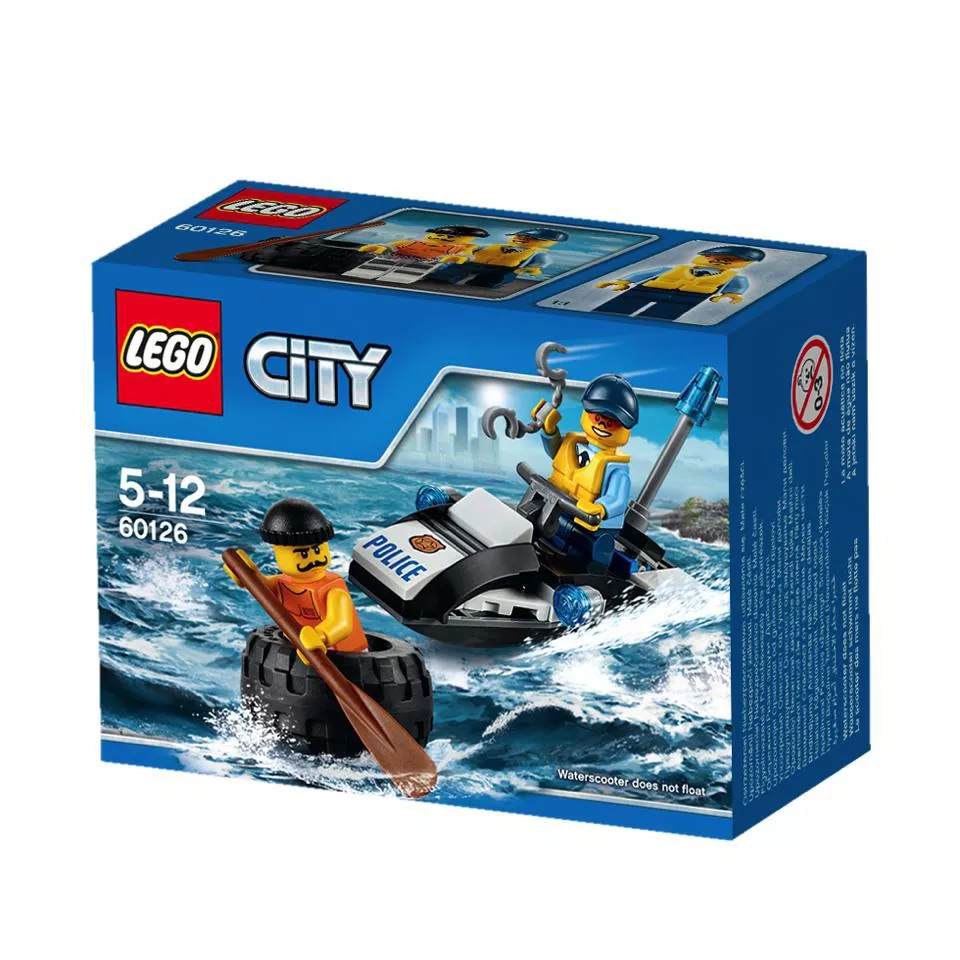 LEGO 60126 - LEGO® City Menekülés kerékabroncson. Járőrözz LEGO® City vizein a rendőrségi jetskivel! Hallottad a bejelentést, hogy egy rabló próbál elevezni egy gumiabroncson? Siess utána és kapd el, mielőtt meglépne, és kattintsd rá a bilincseket, majd vesd fogdába a Börtönszigeten! Őrizd a város biztonságát!