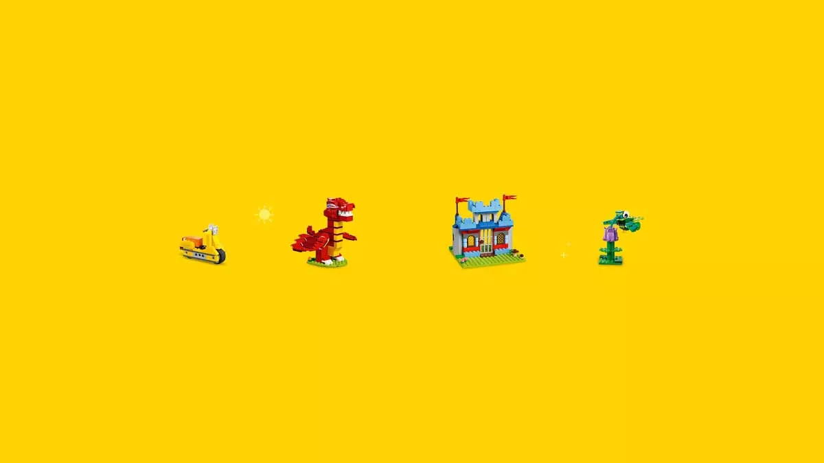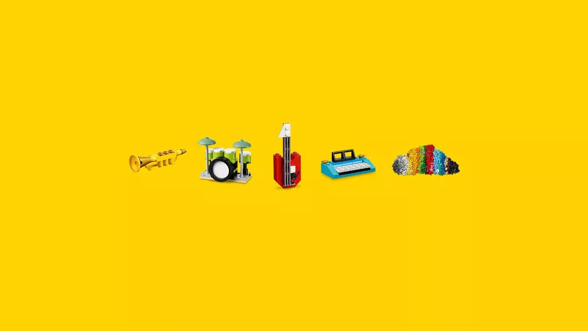Ez a LEGO Classic szett4 különálló építési útmutatót tartalmaz a csoportos játékhoz. A könnyen követhető, illusztrált útmutatókkal még a kezdő építők is átélhetik a saját LEGO játékaik megépítésével járó büszkeséget és örömet. Építhettek trombitát, gitárt, zongorát, dobfelszerelést, piros sárkányt, dinoszauruszt, kacsát, vonatot, teherautót és kastélyt is.