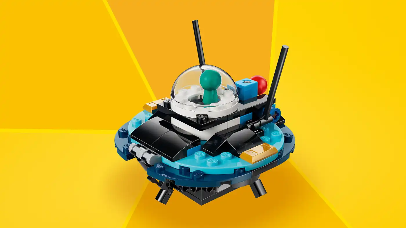 Minden űrjáték tartalmaz egy világító elemet (elemek a dobozban), amelyet a gyerekek egy gomb megnyomásával aktiválhatnak, hogy képeket vetítsenek a távcsőből egy felületre, képeket világítsanak meg a mikroszkóp alatt, vagy hogy elindítsák a fénysugarat az ufó alján. A szettben 3 cserélhető lencse található, amelyeken egy bolygó, egy csillag és a Hold képe látható. Ezeket kivetítheted a távcsővel, vagy megnézheted a mikroszkóp alatt. Fontos: a modelleket egyszerre nem lehet megépíteni! A szett 278 elemből áll.