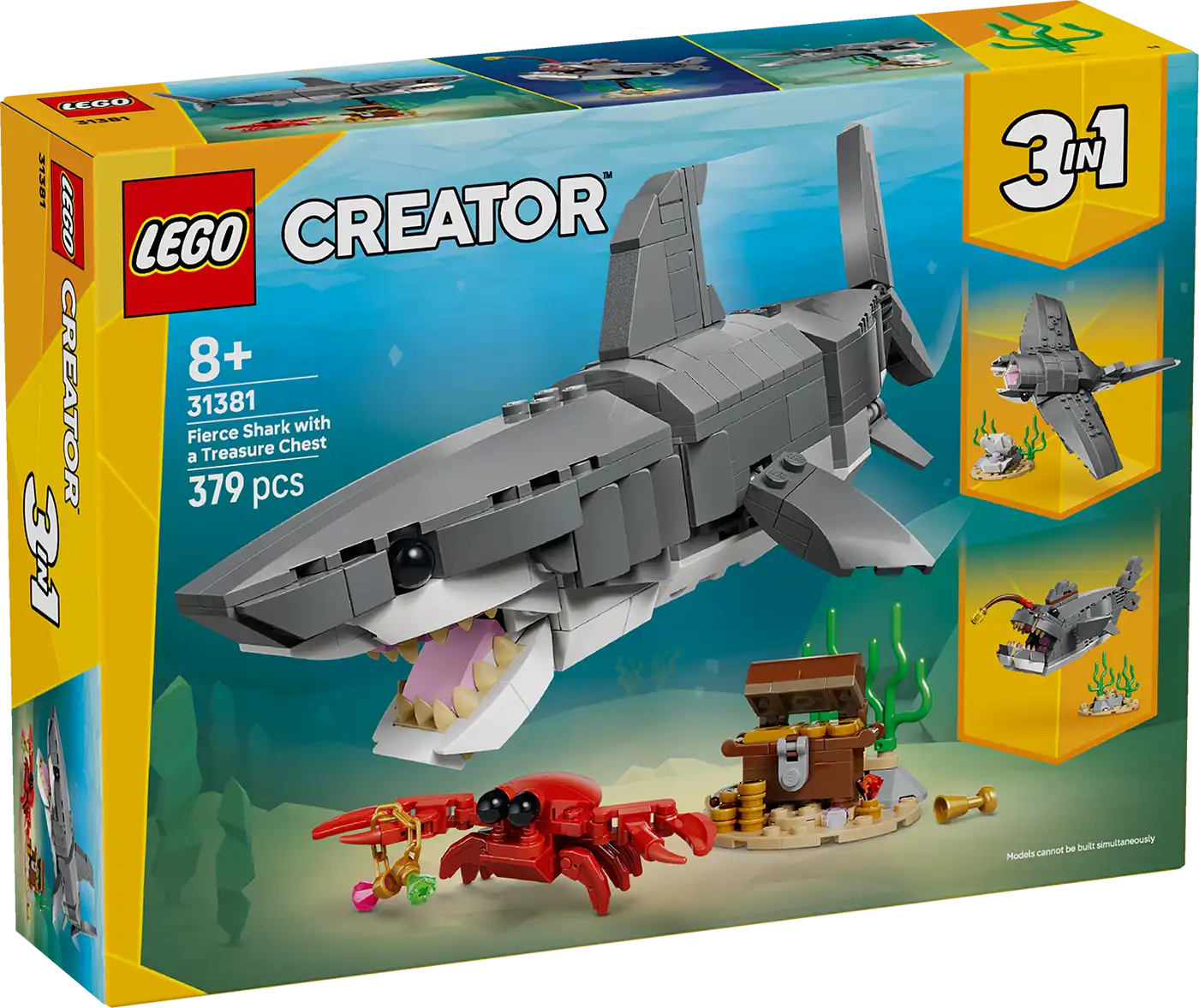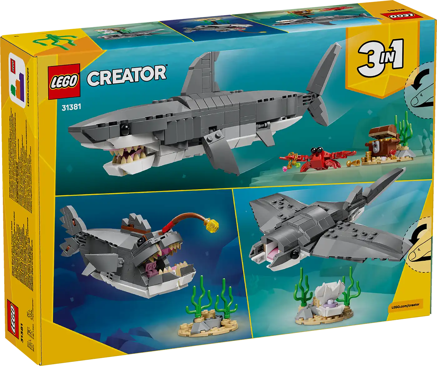 A 8 éves vagy nagyobb fiúk és lányok szórakoztató víz alatti történeteket játszhatnak el a LEGO® Creator 3 az 1-ben Veszedelmes cápa egy kincsesládával (31381) építőjátékkal. Ennek a lenyűgöző, tengeriállat-figurákat rejtő játékkészletnek az építőelemei 3 különböző építési lehetőséget kínálnak a gyerekek számára.