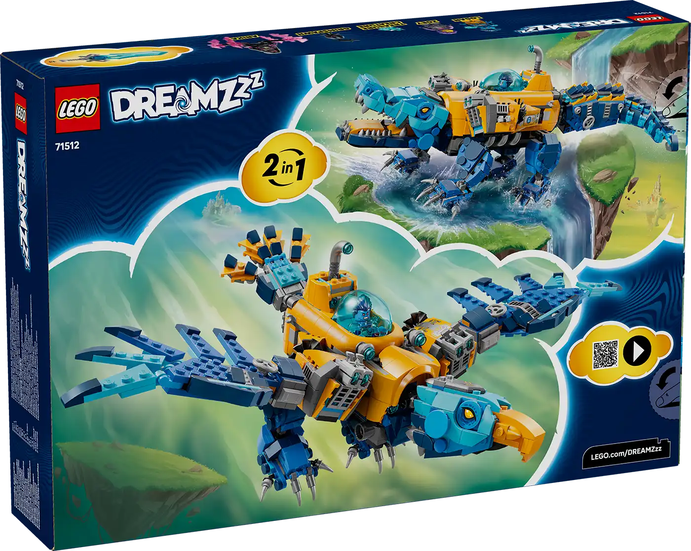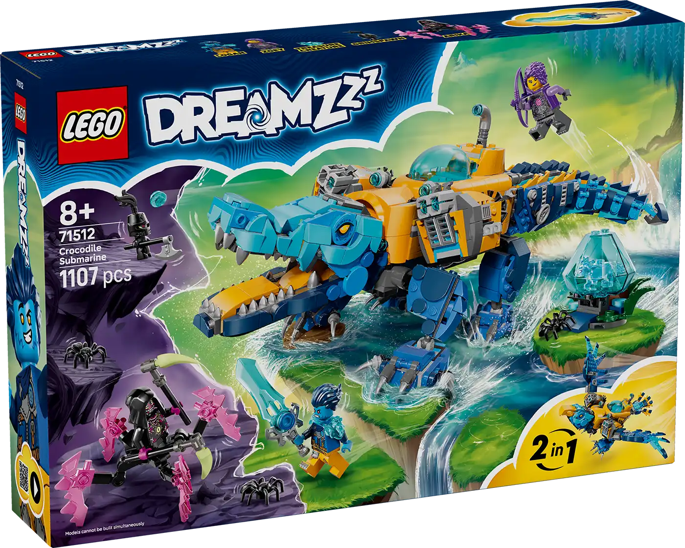 A gyerekek ezzel a 8 éves vagy idősebb fiúknak és lányoknak készült LEGO® DREAMZzz™ Krokodil-tengeralattjáró (71512) építőkészlettel teljesen szabadjára engedhetik kreativitásukat. A készlet két izgalmas építési lehetőséget kínál, amelyekkel az álmodók a tengeralattjáró-játékot krokodil- vagy repülő sasjátékká alakíthatják.
