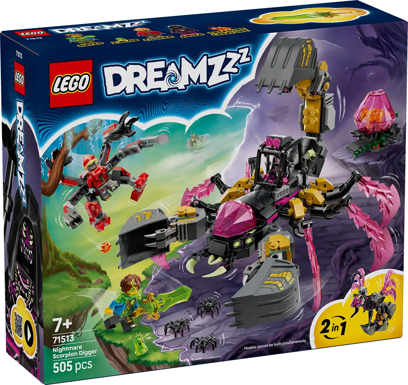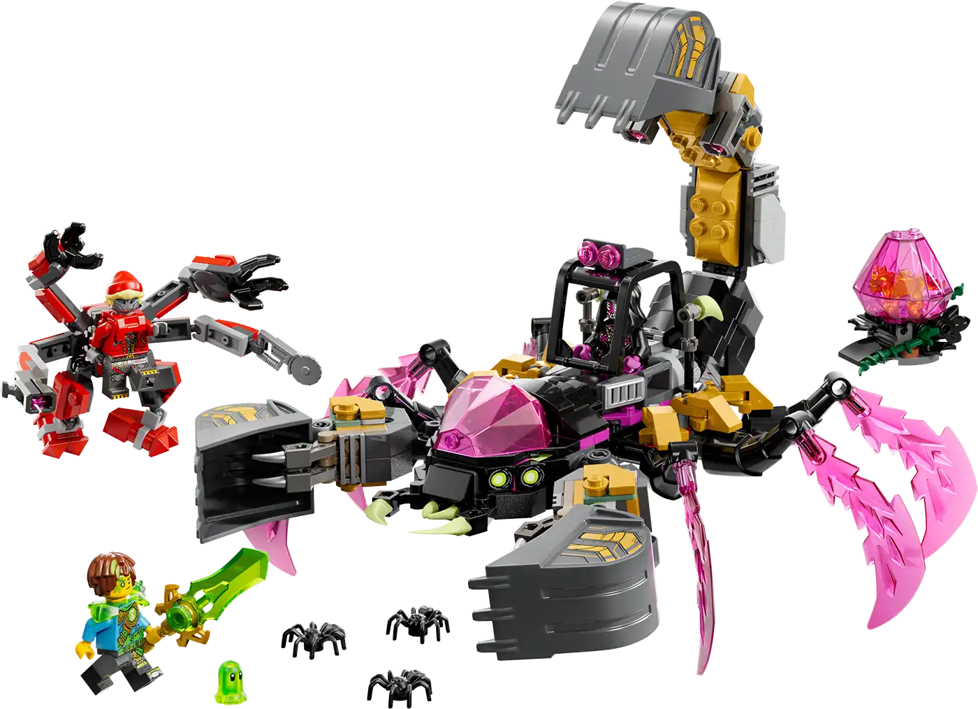 A fantáziadús skorpiójáték egy hatlábú szörnyeteg karmos ollókkal, kilövőkkel és egy kotrógéppel felszerelve, míg a biomechanikus darázsjáték egy karcsú szárnyas ragadozó mérgező kotrógépfullánkkal és kilövőkkel. A fantáziadús játék érdekében a készlet tartalmazza Mateo, Cooper és Arika minifiguráit is, Mateo pedig egy gyűjthető zöld kardkiegészítővel érkezik. A készletben ezenkívül megtalálható még egy Z-Blob figura és 3 pók, valamint egy rózsaszín gyémánttojás, amelyet az Éjcsászár elátkozott, és amelyből egy gyűjthető narancssárga Kincslény játék kel ki.