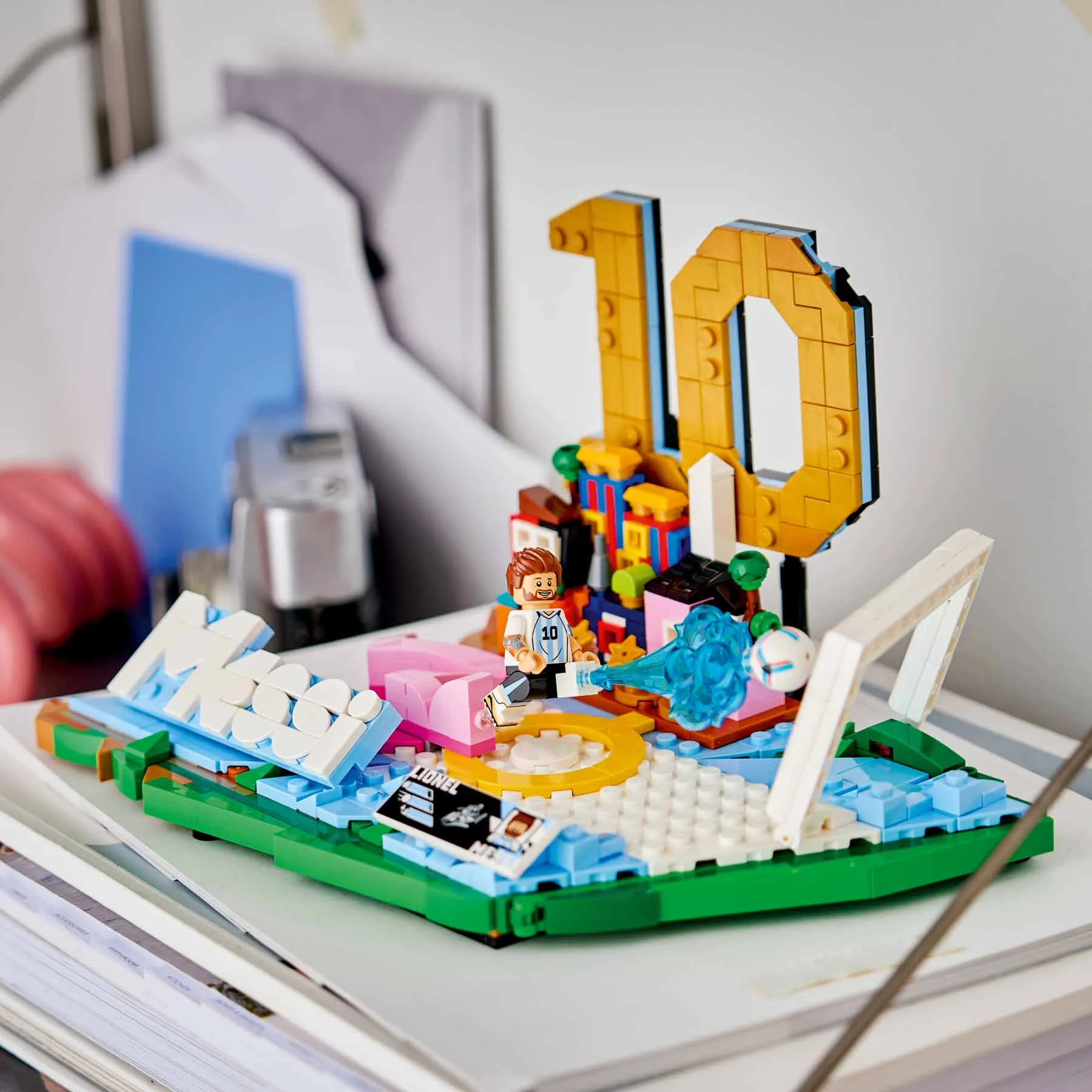 A futballrajongóknak nagy örömöt okoz majd ennek a Messit ünneplő, gyűjthető és kiállítható modellnek a megépítése. Az alap a focista monogramját formázza, és az argentin válogatott színeiben pompázik, valamint egy nagy 10-es számot ábrázol, amely a focista egyik ikonikus mezszámát jelképezi. Egy Lionel Messi minifigura kelti életre a készletet, amely még egy gyűjthető táblát is tartalmaz, amelyen a játékos statisztikái és neve látható, valamint rengeteg meglepetést, amelyek az életére és karrierjére utalnak. A kész szett egy klassz ajándéktárgy, amely Messi előtt tiszteleg és focis dekoráció, amit a rajongók büszkén mutogathatnak majd.