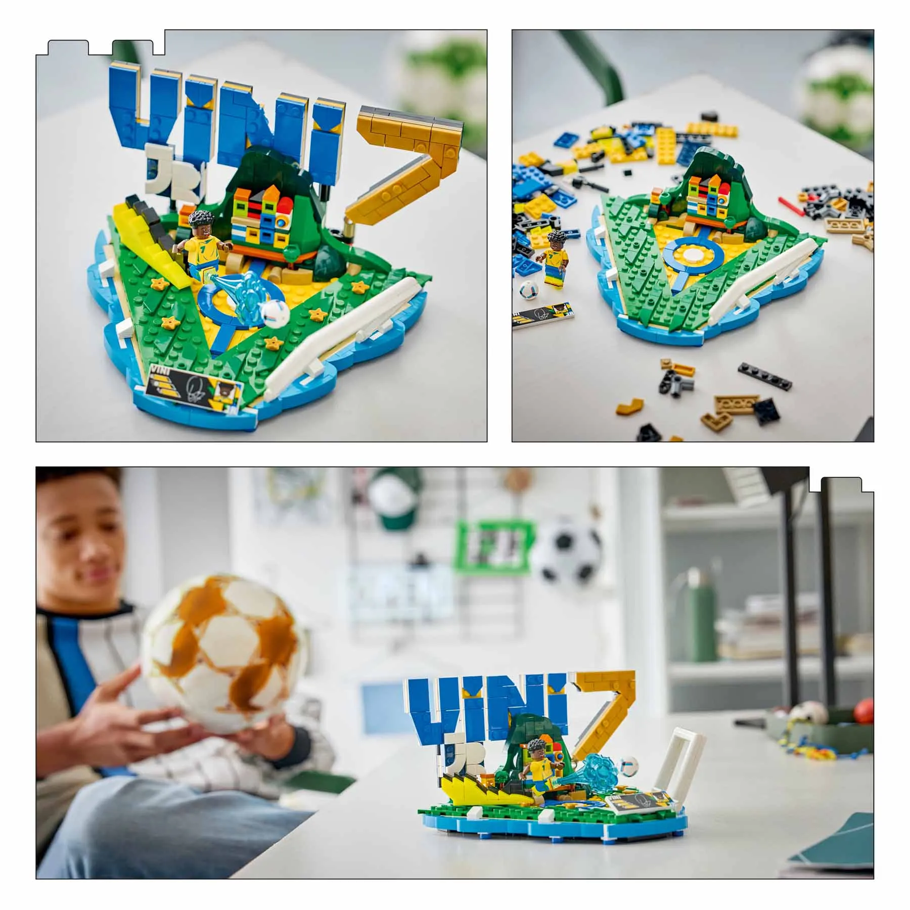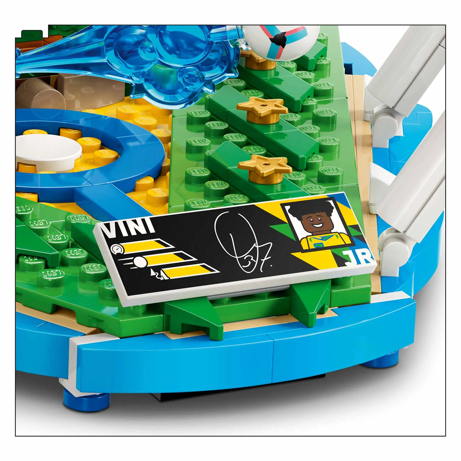 A futballrajongók egy fiatal sportlegendát ünnepelhetnek, miközben megépítik ezt a Vinicius Juniorról mintázott kiállítható modellt, és felfedezik az összes meglepetést. Az alaplap Vinicius kezdőbetűjét ábrázolja, és a brazil válogatott színeiben pompázik, valamint egy nagy 7-es számot, a focista mezszámát is tartalmazza. A készlet része egy gyűjtői tábla is, amelyen a játékos statisztikái és aláírása látható, valamint egy Vini Jr. minifigura, amely életre kelti a szettet. Ez a remek Vini Jr. előtt tisztelgő relikvia az elkészülte után klassz, gyűjthető futball-dekorációvá válik, amelyet a rajongók büszkén mutogathatnak.