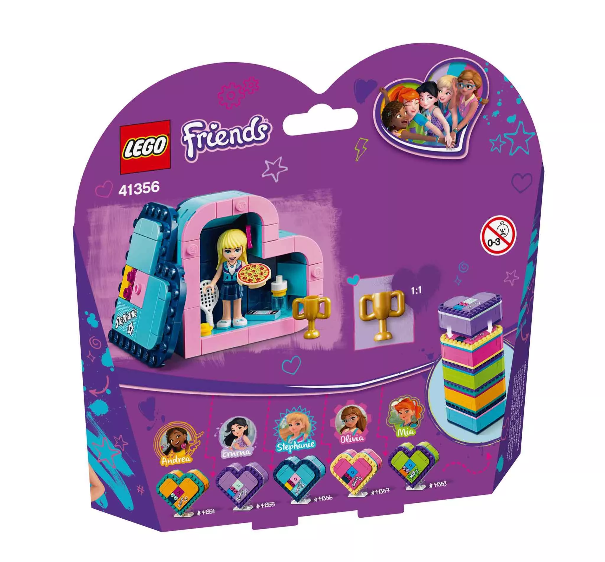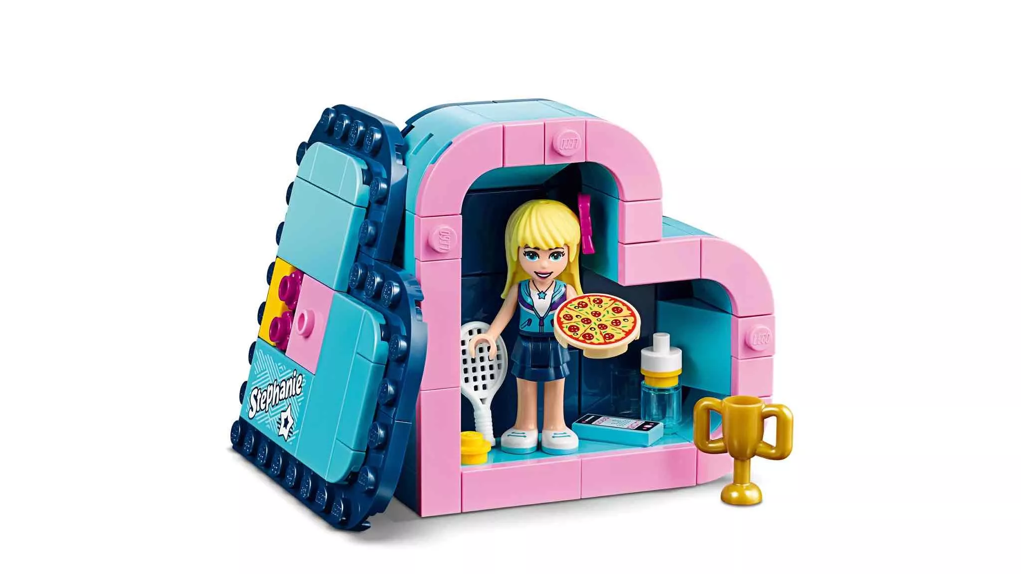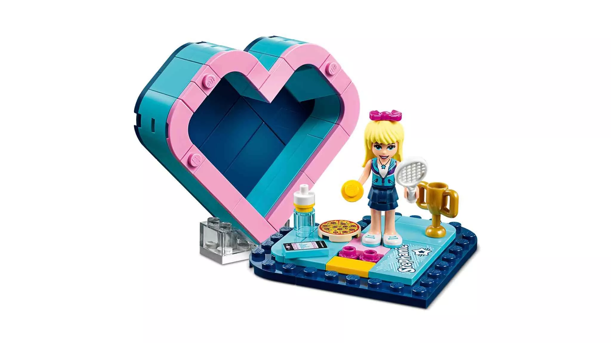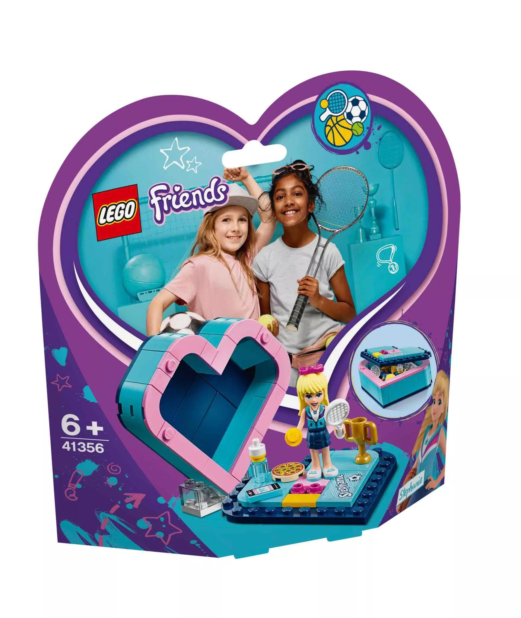 LEGO 41356 - LEGO Friends Stephanie Szív alakú doboza. Vidd el a sportcsillag LEGO® Friends Stephanie-t egy utazásra saját szív alakú dobozában! Építsd meg a dobozt, majd pakold bele mobiltelefonját és hajba való masniját — Stephanie néhány kedvenc dolgát. Gyakorlat teszi a mestert, Stephanie-nak pedig szüksége van sportfelszerelésére, bárhová is megy, szóval gondoskodj róla, hogy bepakold teniszütőjét és labdáját is! Az erőfeszítéseit végül siker koronázta, hiszen az övé a hőn áhított arany trófea! A rengeteg munka után segíts neki feltöltődni egy finom pizzával, amit egy itallal öblít le a vizes palackból. Ez egy igazi utazó készlet, hiszen minden elem belefér a szív alakú dobozba, ami egyben is tartja őket. Vedd le a doboz tetejét és használd olyan emelvényként, melyen Stephanie stabilan meg tud állni — tökéletes játék utazáshoz!
