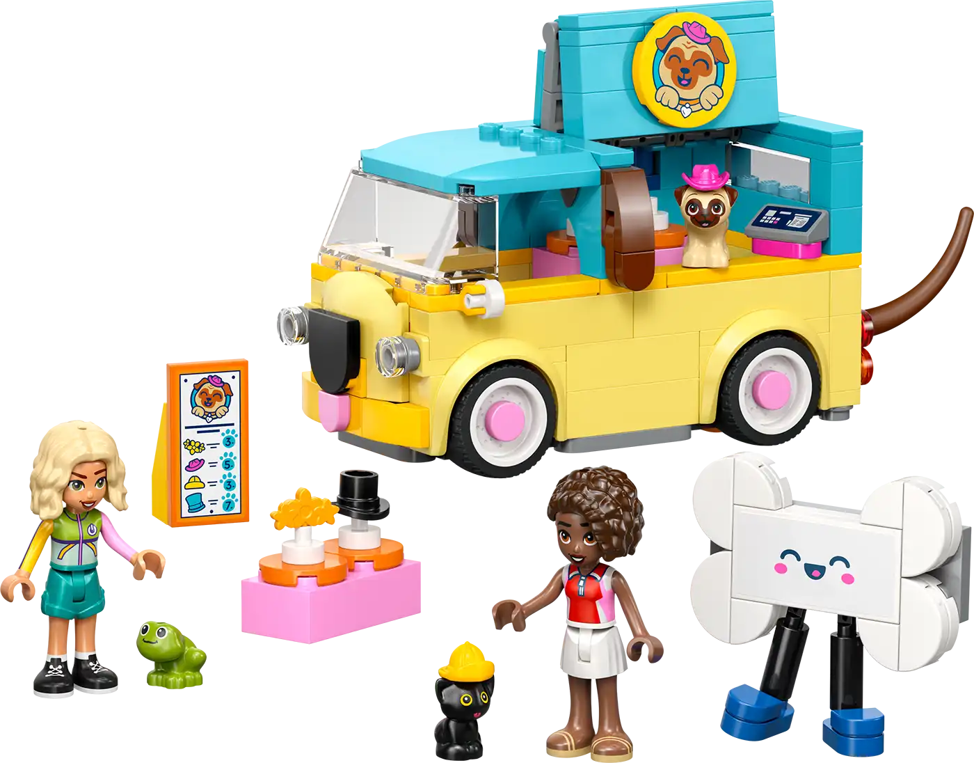 A részletgazdag építőkészlet 2 figurával, cica, kutya és béka állatfigurákkal, valamint aranyos kisállat-kiegészítőkkel hív a szabad, kreatív játékra. Ez a szett tele van vidám pillanatokkal: megcsodálhatod a mopszalakú furgont, és megnézheted, hogyan csóválja a farkát menet közben. Légy kreatív, és segíts a kis kedvenceknek felpróbálni a különféle kalapokat, például az esőkalapot, a cowboykalapot, a cilindert és a virágkoszorút! Nézd meg az aranyos csontfigurát, majd pakold be a kiegészítőket a furgonba, és készülj fel a következő kalandra!