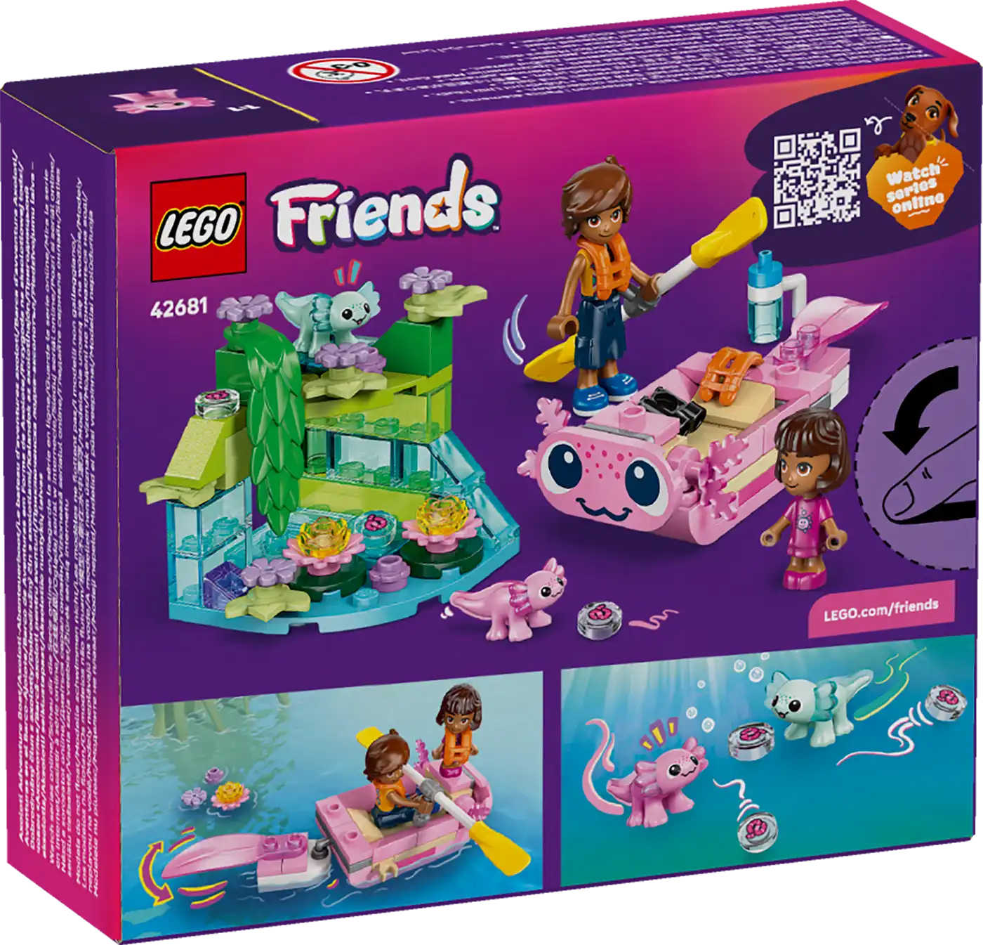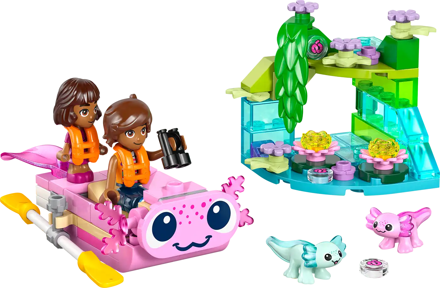 A gyerekek remekül szórakozhatnak majd az axolotltémájú csónakkal, amelyet egy barátságos arc és egy ficánkoló farok díszít. A csónakon vannak ülőhelyek a figurák számára, és 2 mentőmellény is tartozik hozzá. A melléképítmény növényeket, virágokat és vizet jelenít meg, így a gyerekek megépíthetik az axolotlok természetes élőhelyét.