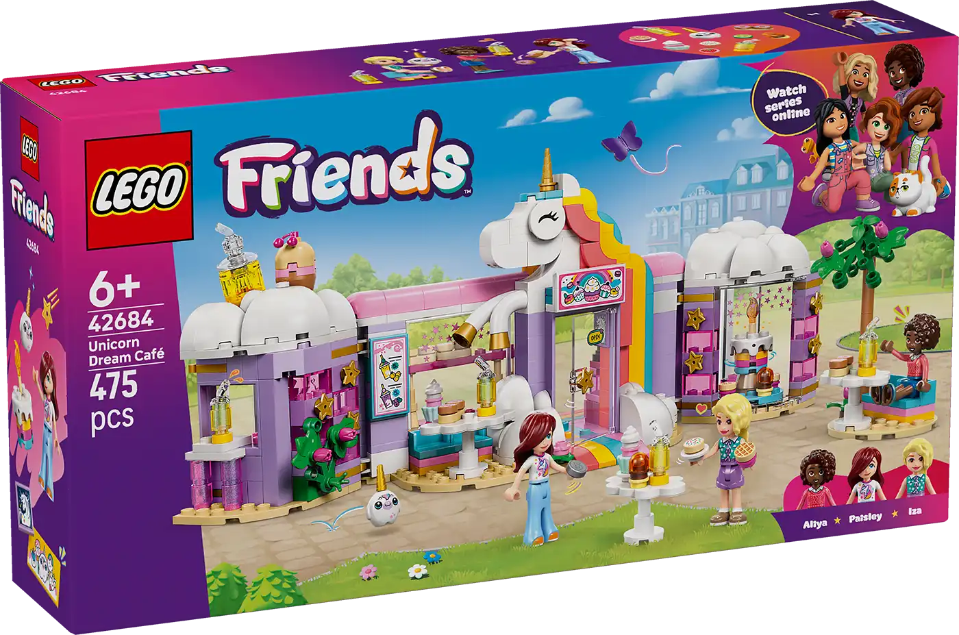 Ez a részletgazdag építőkészlet 3 figurával, játék tortákkal, fánkokkal, gofrikkal és süteményekkel inspirálja a gyerekeket a szabad játékra. Találhatók még benne aranyos muffinok is, amelyeket a kirakatban vagy a forgótányéron lehet kiállítani. Még több történetmesélési lehetőséget kínál a gyümölcslé- és a turmixbár, a beltéri és kültéri ülőhely, a pénztárgép és LEGO plüss unikorniskiegészítő. A Friends ifjú rajongói kreatív játékokat játszhatnak a kávézó tulajdonosával, Izával, valamint a vendégekkel, Paisley-vel és Aliyával.