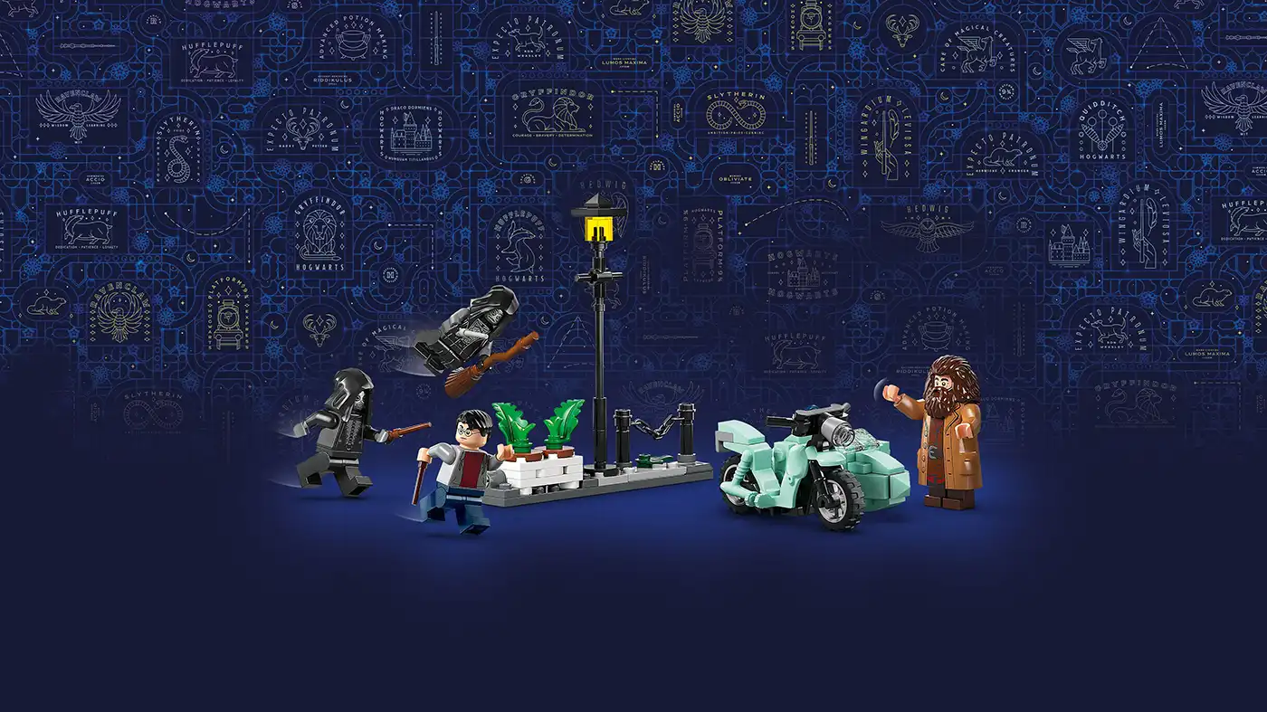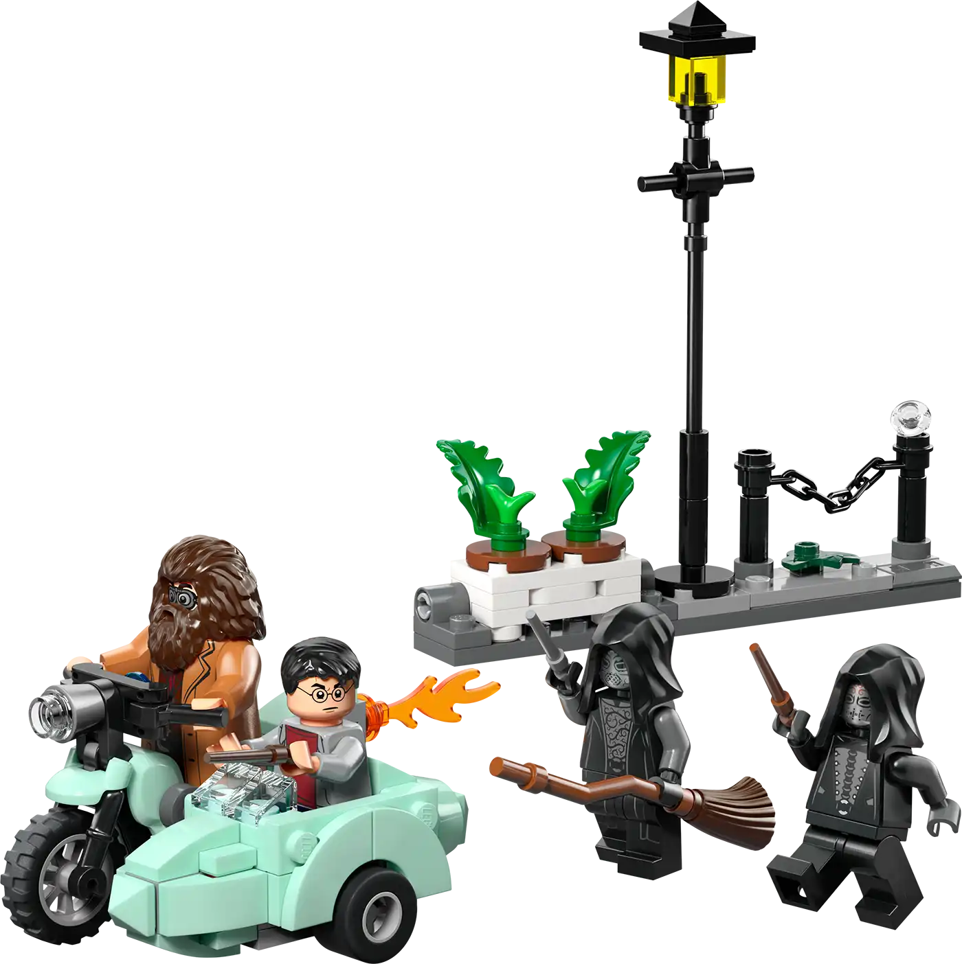 Helyezd Rubeus Hagrid minifiguráját a motorkerékpárra és Harry Pottert az oldalkocsiba! Illeszd a 2 halálfaló-minifigurát a Privet Drive-jelenetre, ahol egy lámpaoszlop és több virágcserép található! A cserepek felborulnak a hősök vakmerő menekülése során.