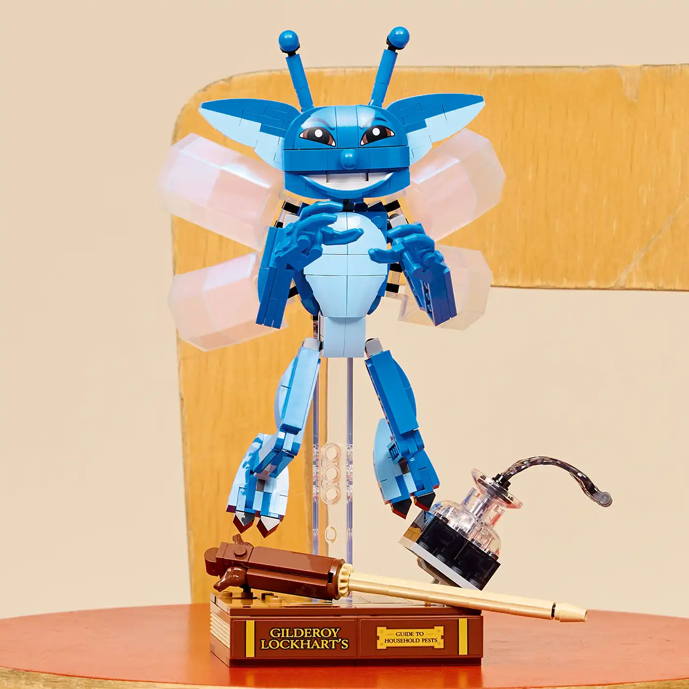 Állítsd repülő helyzetbe a Kelta tündérmanót az átlátszó bemutatóállványon, vagy állítsd a lábára, és játssz vele! Ehhez a gyerekeknek készült építőjátékhoz ikonikus kiegészítők is tartoznak. Állítsd ki a tündérmanó-figurát a megépíthető Gilderoy Lockhart™ könyvvel és a felborult tintatartóval!