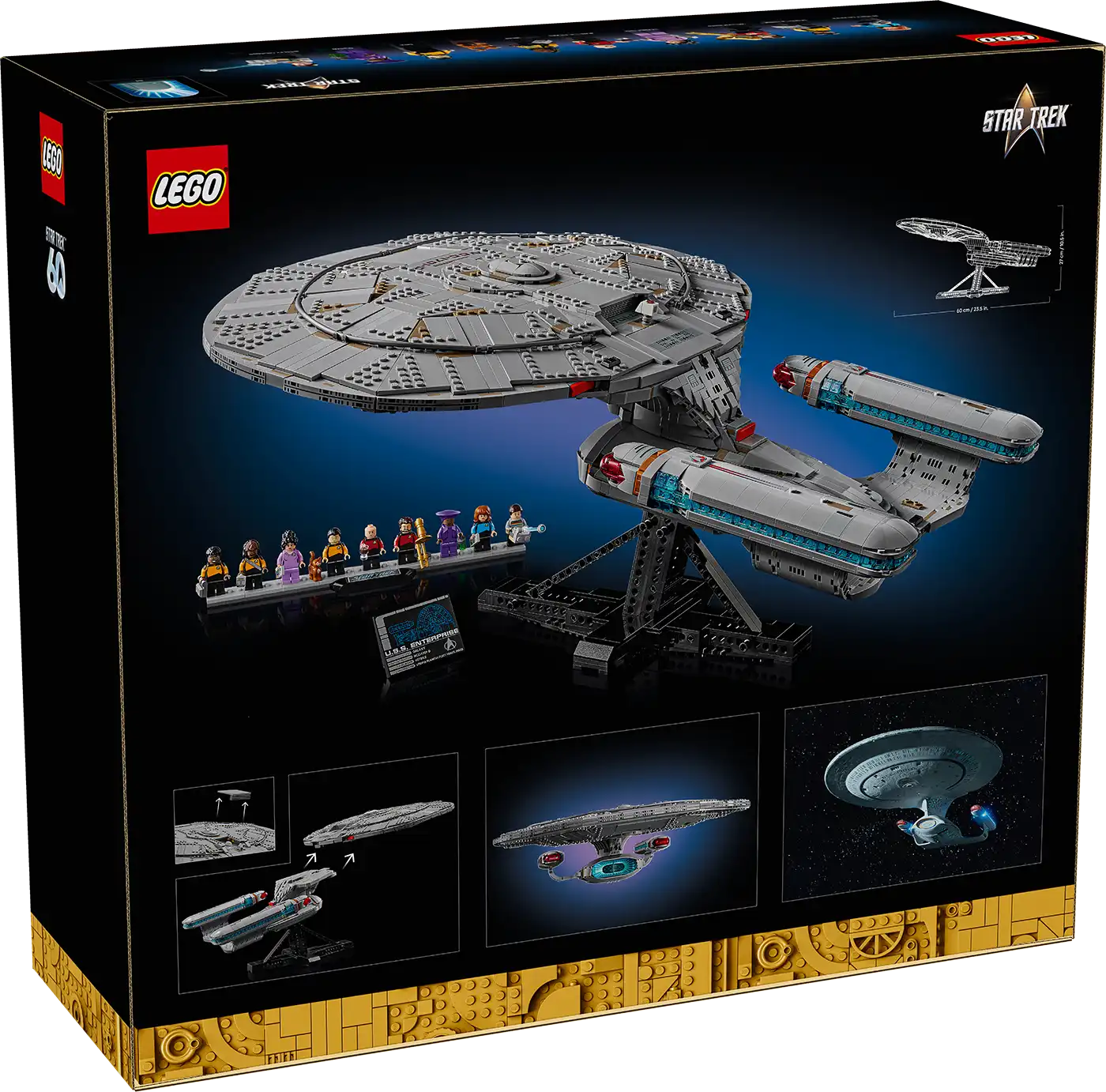 Méretek – Ebben a 3600 elemből álló építőkészletben az U.S.S. Enterprise űrhajómodell, a bemutatóállvánnyal együtt, 27 cm magas, 60 cm hosszú és 48 cm széles.