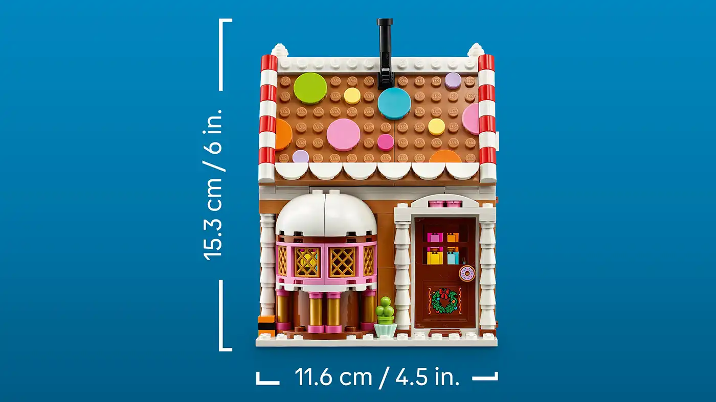 Méretek – Ez a 498 elemből álló, mézeskalács házikós készlet 15 cm magas, 12,5 cm széles és 11,5 cm mély.