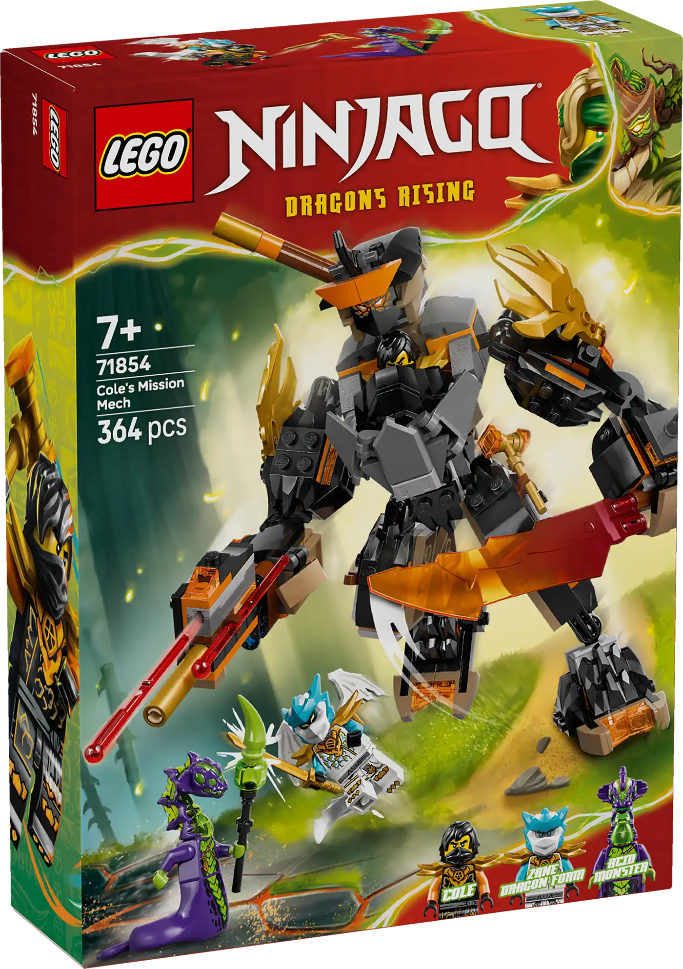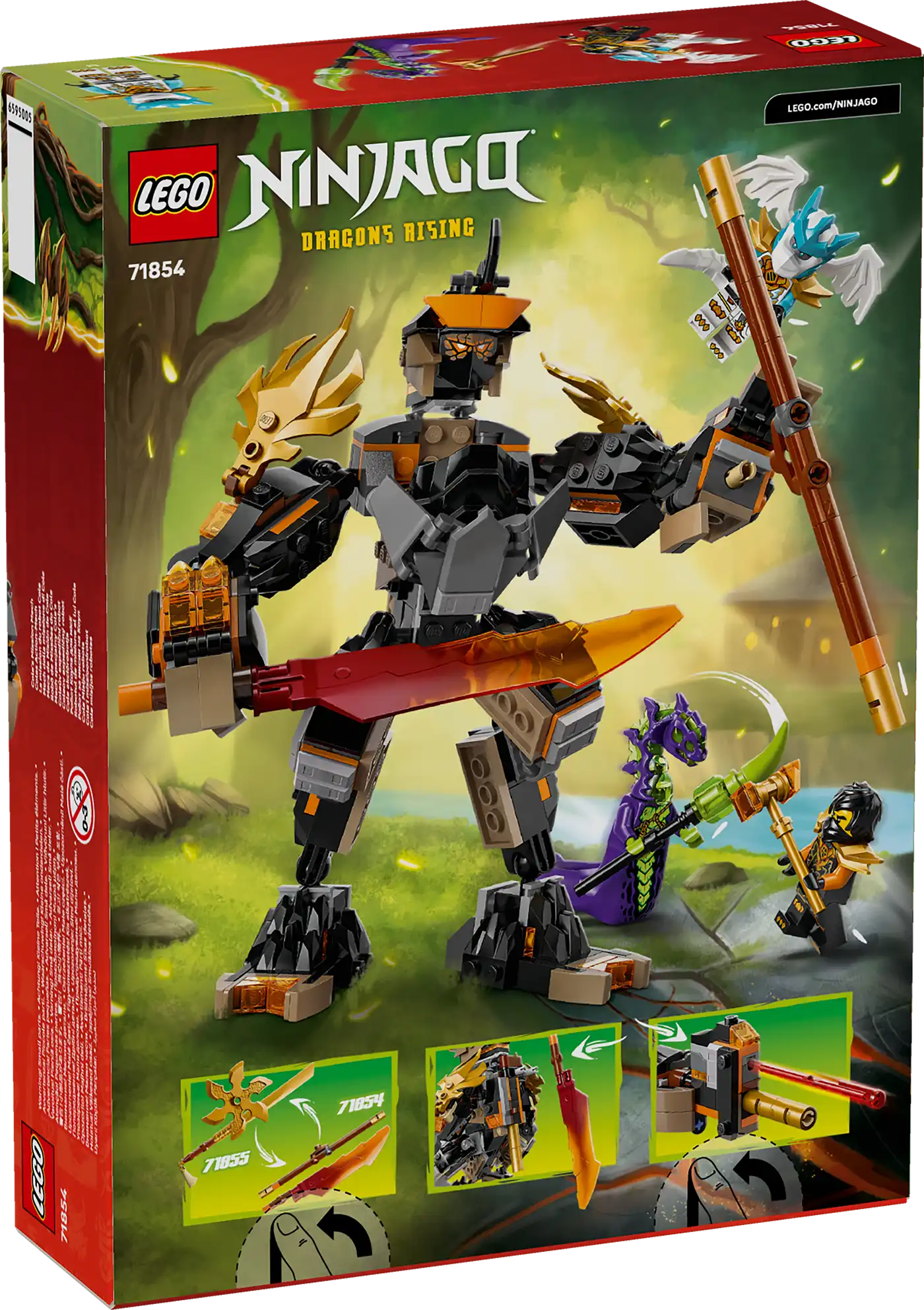 A robot 3 fegyverrel rendelkezik: egy karddal, egy bottal és egy rugós kilövővel, amelyhez 2 nyíl is tartozik, és amelyeket a gyerekek kicserélhetnek a Riyu, a nindzsasárkány csatája (71855) készlet (külön kapható) fegyvereire! Ez a NINJAGO játék 3 minifigurát is tartalmaz: Cole kalapáccsal, a sárkányformát öltő Zane karddal és a maró szörny botjával a fantáziadús csatákhoz.