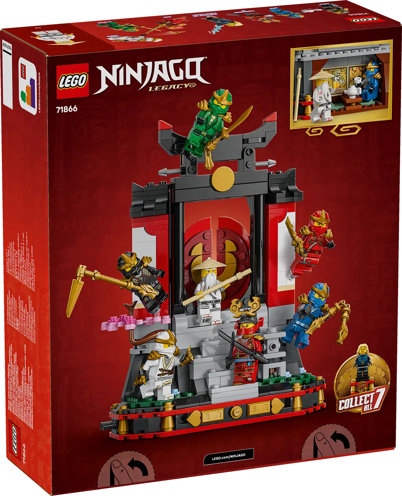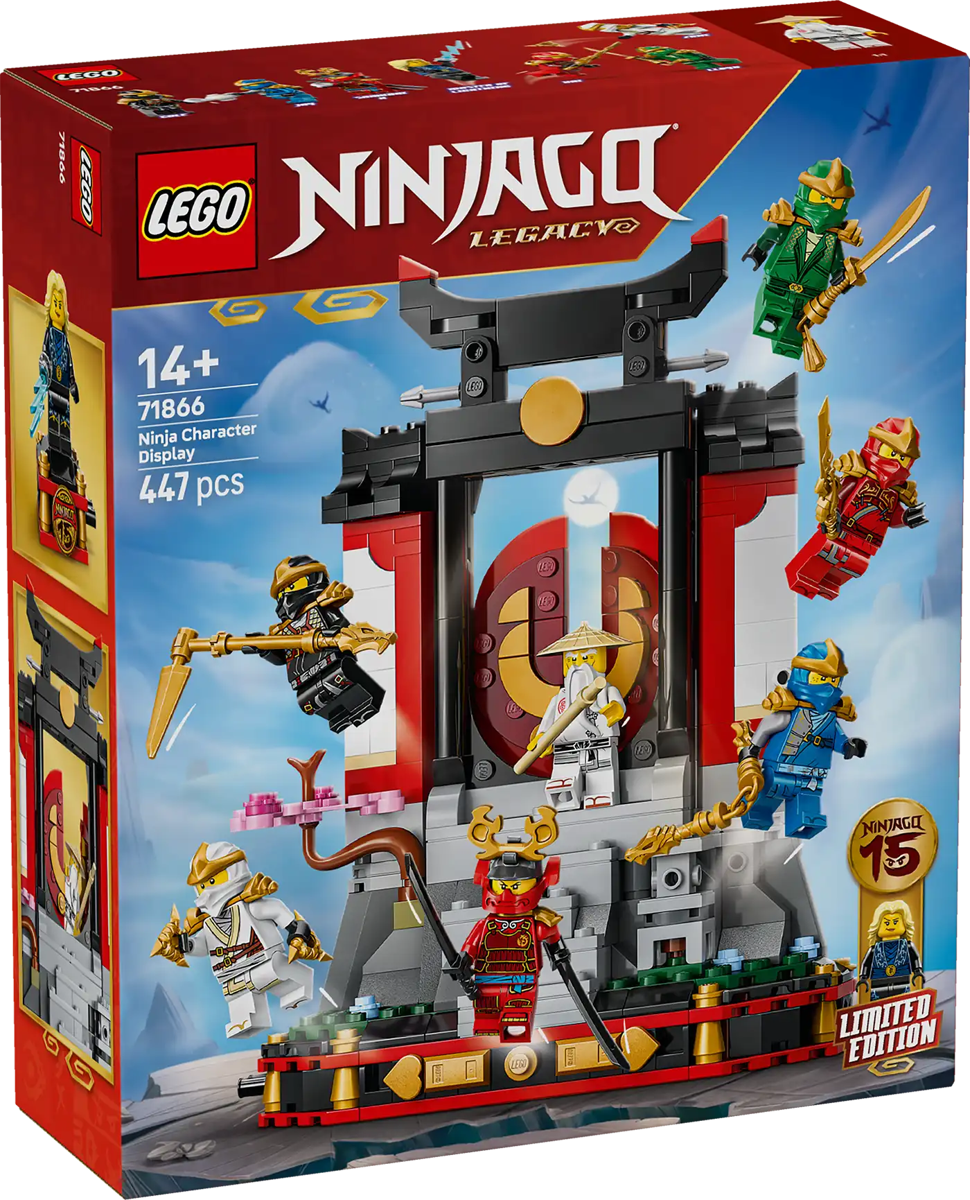 A 14 éves és nagyobb fiúk, lányok és nosztalgikus nindzsarajongók megünnepelhetik a LEGO® NINJAGO® tévésorozat 15. évfordulóját ezzel a 8 minifigurát tartalmazó Kiállítható nindzsafigurák, 15. évforduló (71866) készlettel. Ez a kiváló minőségű nindzsás játék kolostor lépcsőkkel, nyitható kapuval, kőlámpással, virágzó cseresznyefával és a hátsó részén egy teaházzal rendelkezik, amelyen a híres NINJAGO csata jelenik meg matricák formájában.