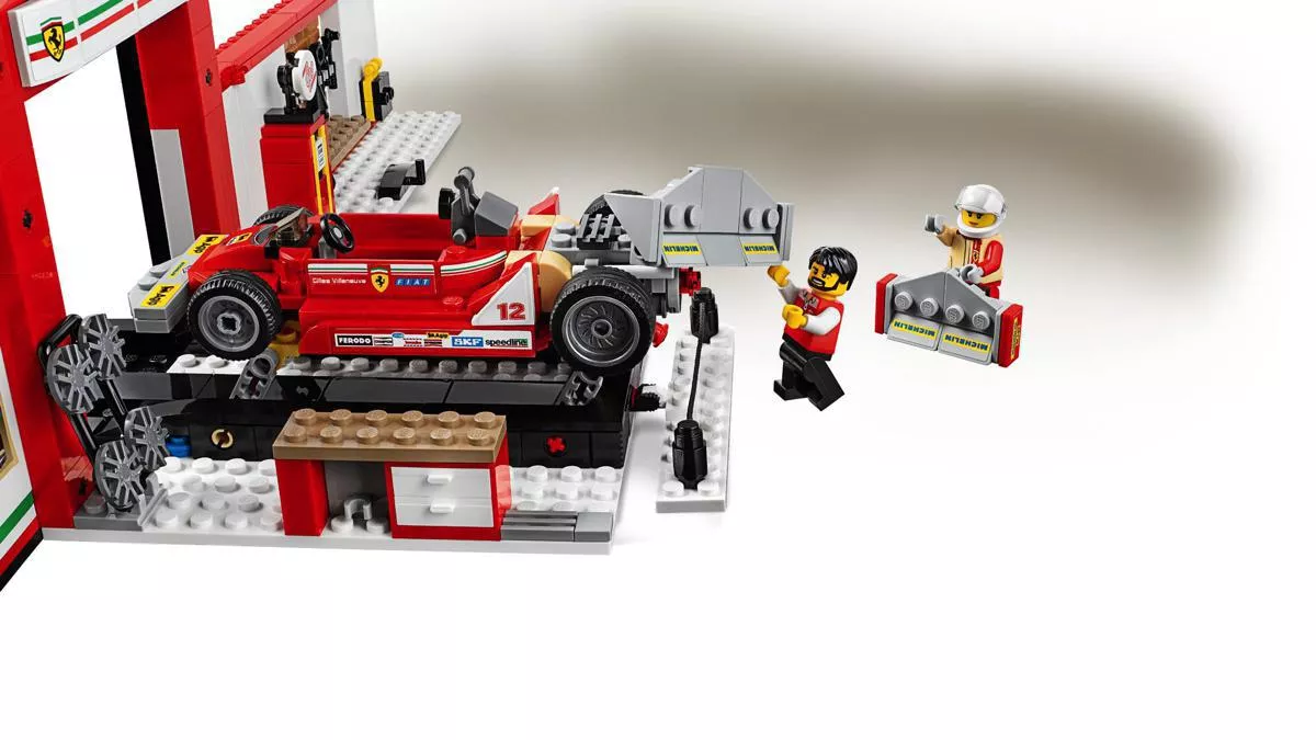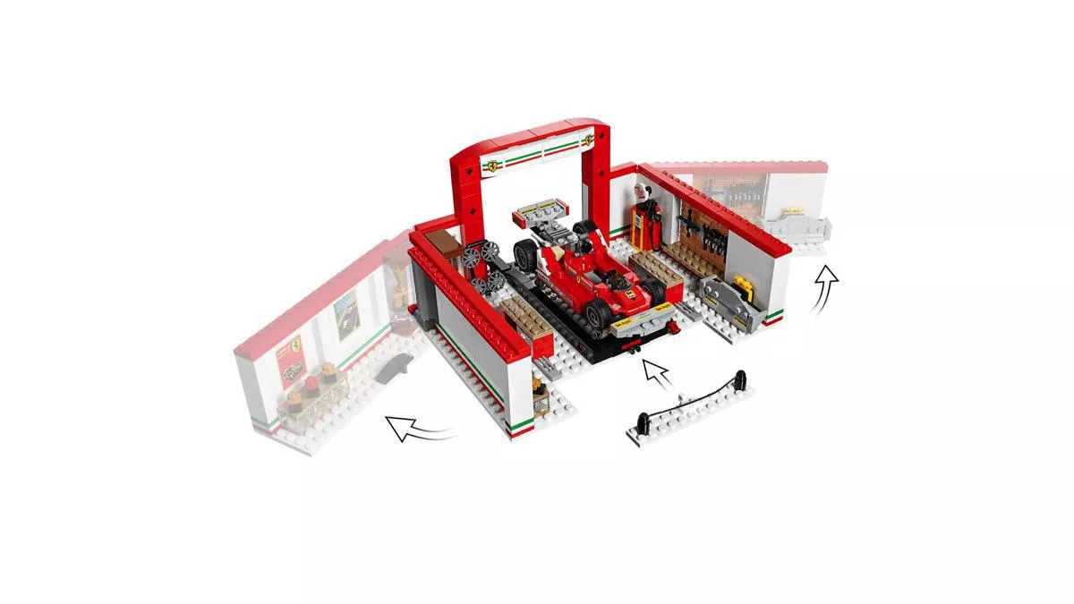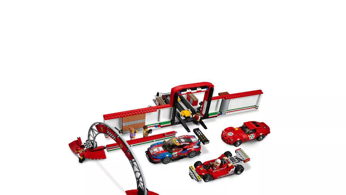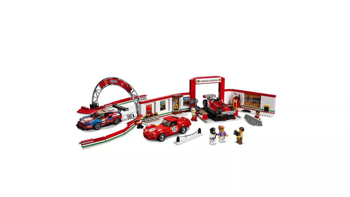 A csomagban 7 minifigura található: egy klasszikus Ferrari 250 GTO autóversenyző, Ferrari 488 GTE autóversenyző, történelmi Ferrari 312 T4 autóversenyző, versenyrendező, versenyautó szerelő és 2 látogató. A műhely/múzeum méretei: több mint 10 cm magas, 22 cm széles és 18 cm mély, és 50 cm széles amikor szét van nyitva. A versenypálya méretei: több mint 13 cm magas, 30 cm széles, és 50 cm mély. A Ferrari 250 GTO méretei: több mint 5 cm magas, 15 cm hosszú és 6 cm széles. A Ferrari 488 GTE méretei: több mint 5 cm magas, 16 cm hosszú és 6 cm széles.  A Ferrari 312 T4 méretei: több mint 4 cm magas, 16 cm hosszú és 6 cm széles