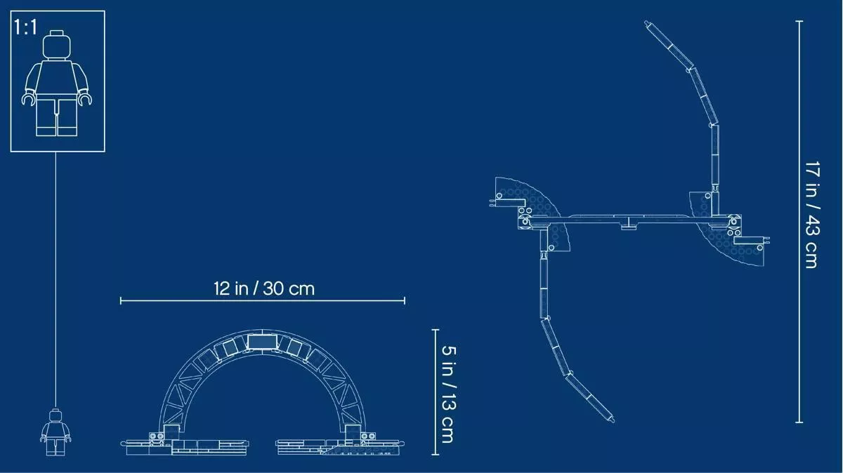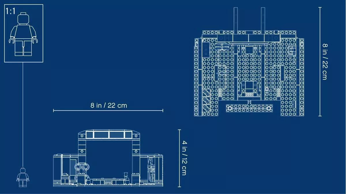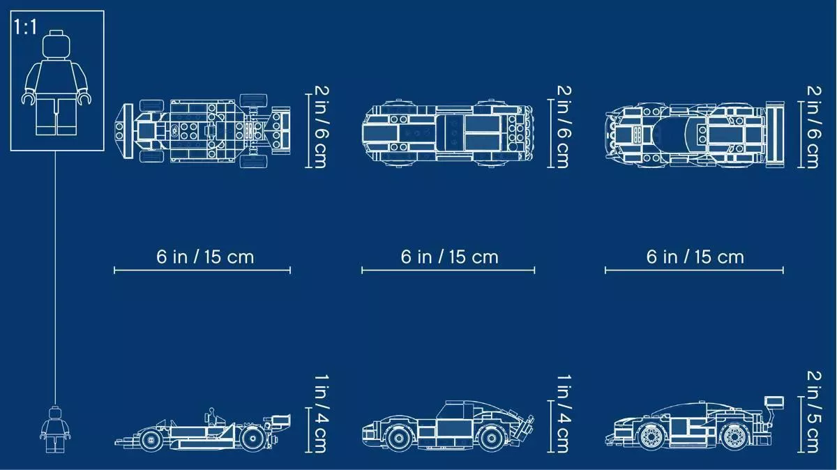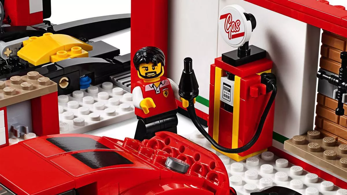 A csomagban 7 minifigura található: egy klasszikus Ferrari 250 GTO autóversenyző, Ferrari 488 GTE autóversenyző, történelmi Ferrari 312 T4 autóversenyző, versenyrendező, versenyautó szerelő és 2 látogató. A műhely/múzeum méretei: több mint 10 cm magas, 22 cm széles és 18 cm mély, és 50 cm széles amikor szét van nyitva. A versenypálya méretei: több mint 13 cm magas, 30 cm széles, és 50 cm mély. A Ferrari 250 GTO méretei: több mint 5 cm magas, 15 cm hosszú és 6 cm széles. A Ferrari 488 GTE méretei: több mint 5 cm magas, 16 cm hosszú és 6 cm széles.  A Ferrari 312 T4 méretei: több mint 4 cm magas, 16 cm hosszú és 6 cm széles