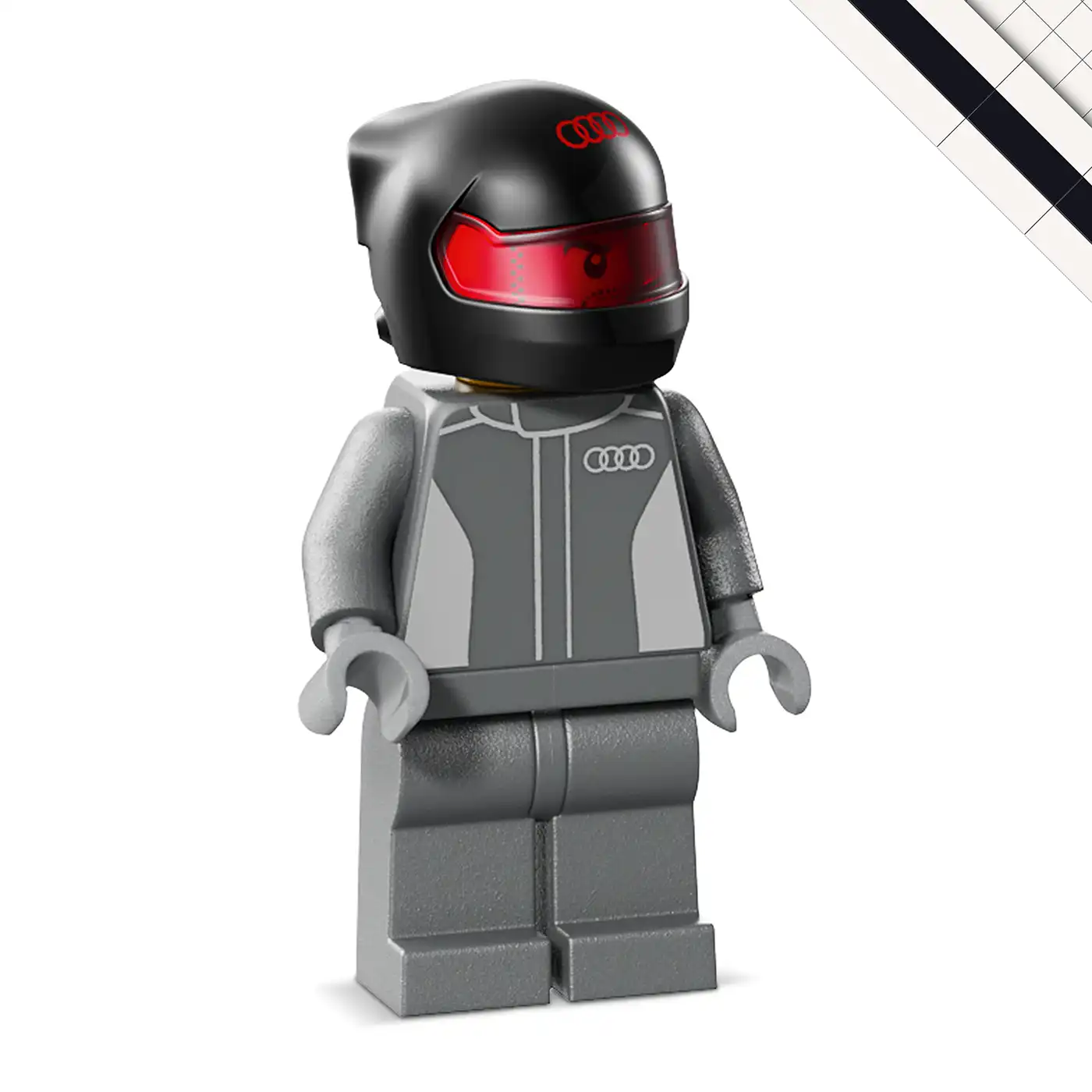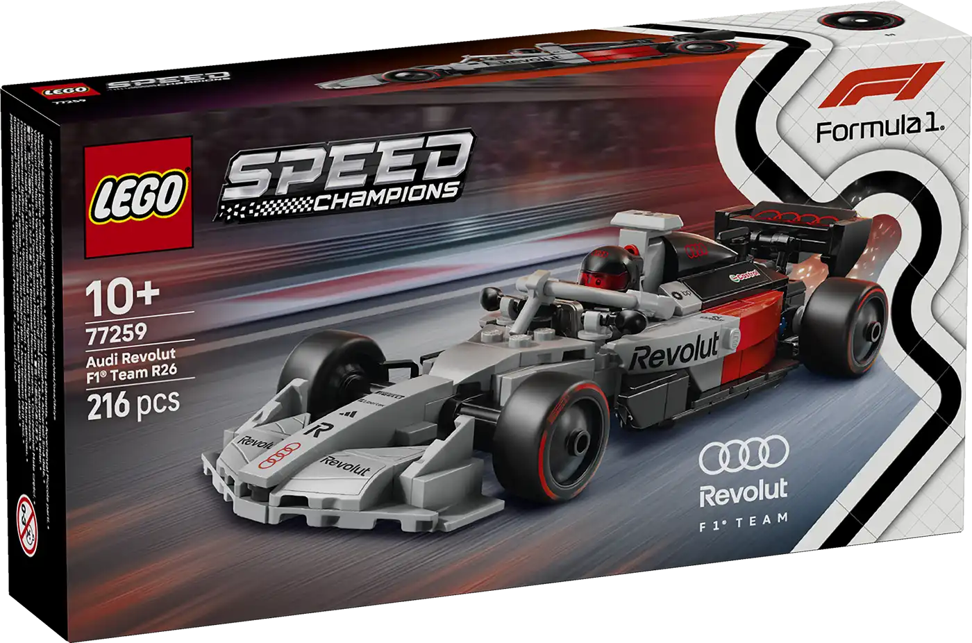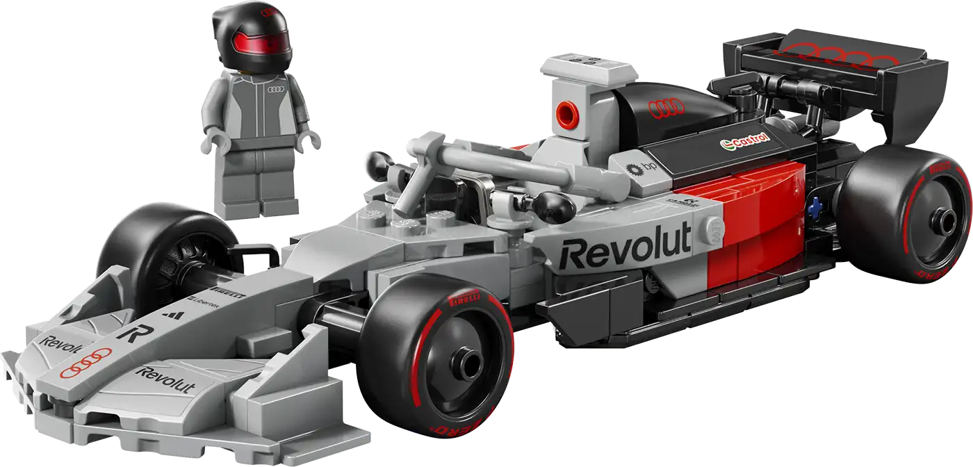 Az Audi Revolut F1® Team R26 játék versenyautó pilótafülkével, hátsó szárnnyal, hiteles szponzorlogókkal, első kerékfelfüggesztéssel és „Pirelli” felirattal ellátott gumiabroncsokkal rendelkezik. A játék autóhoz tartozik egy Audi Revolut F1® Team ruhát és sisakot viselő minifigura is, amelyet a pilótafülkébe lehet helyezni a verseny indulása előtt.