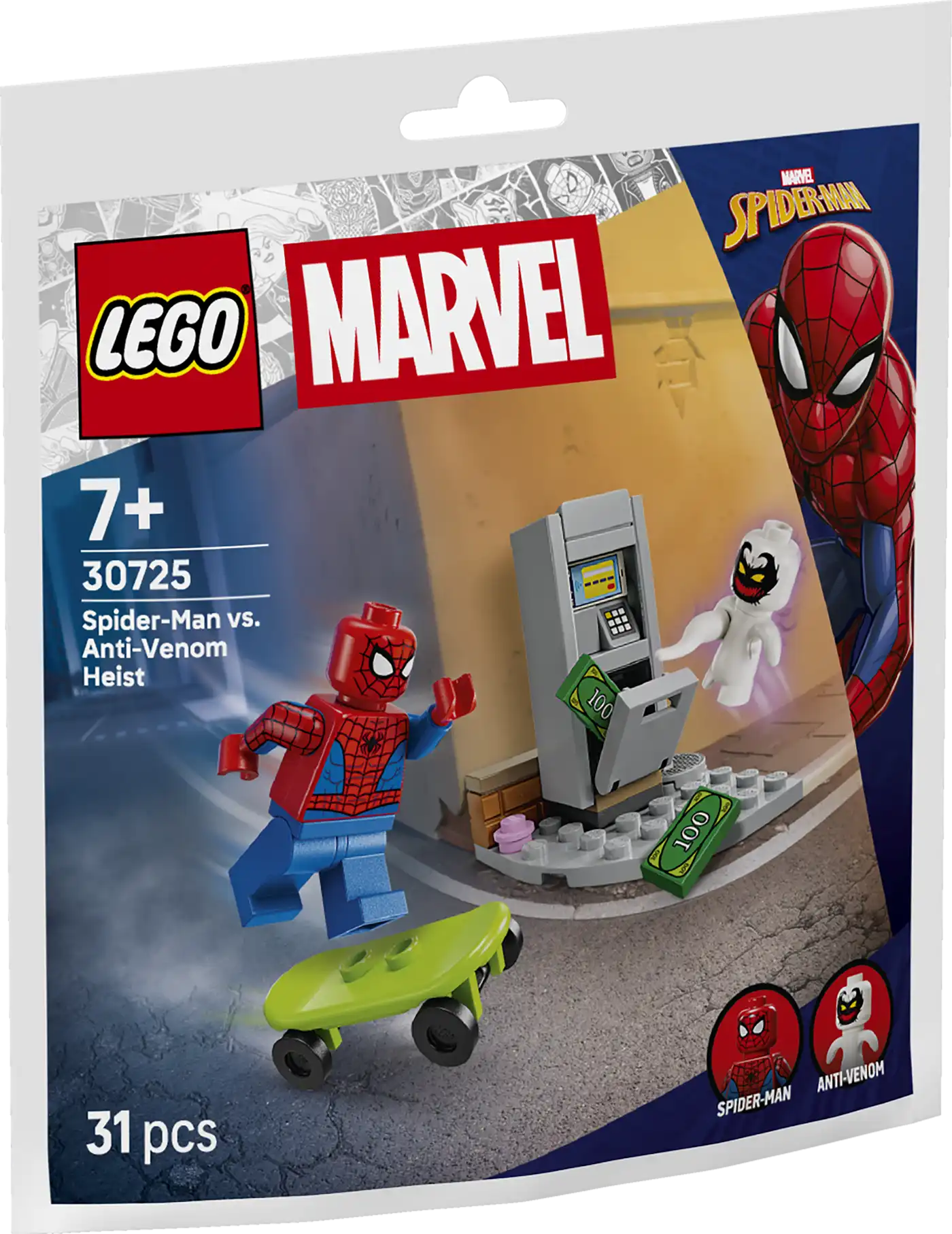 Anti-Venom feltör egy ATM-et a sarkon, és kilopja belőle a pénzt. Pókember észreveszi a menekülő gonosztevőt, és üldözőbe veszi egy gördeszkán.