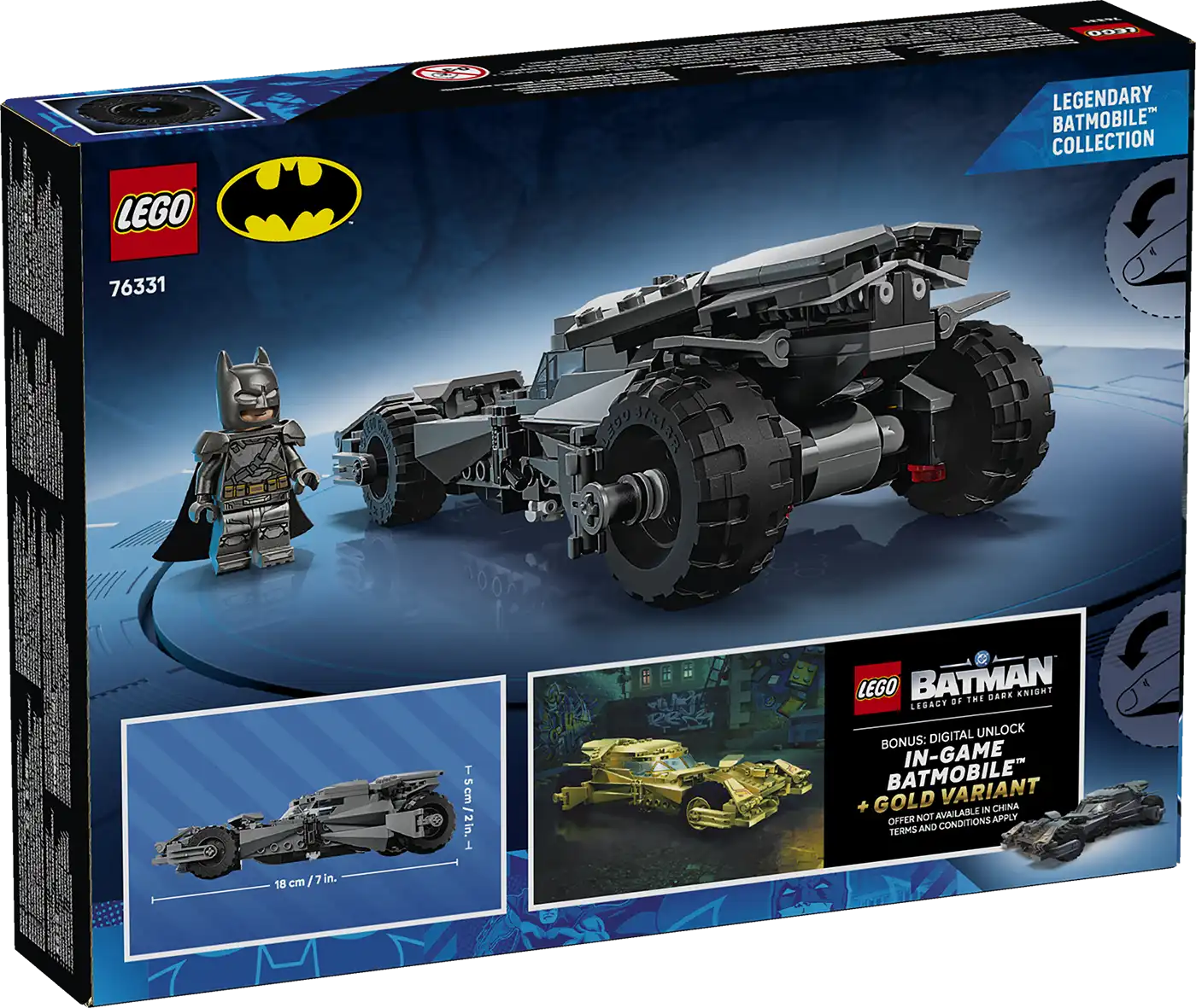 Bónusz: Digitális beváltás funkció: Váltsd be a Batman Superman ellen: Batmobile-t és a Batmobile arany változatát a LEGO Batman – A sötét lovag öröksége™ videojátékban. Olvasd be az építési útmutatón megtalálható QR-kódot, és kövesd az utasításokat!