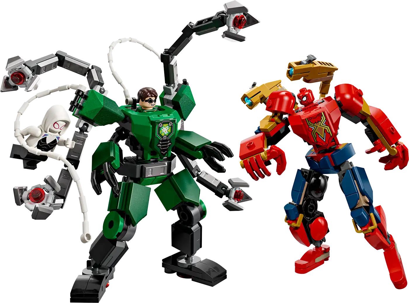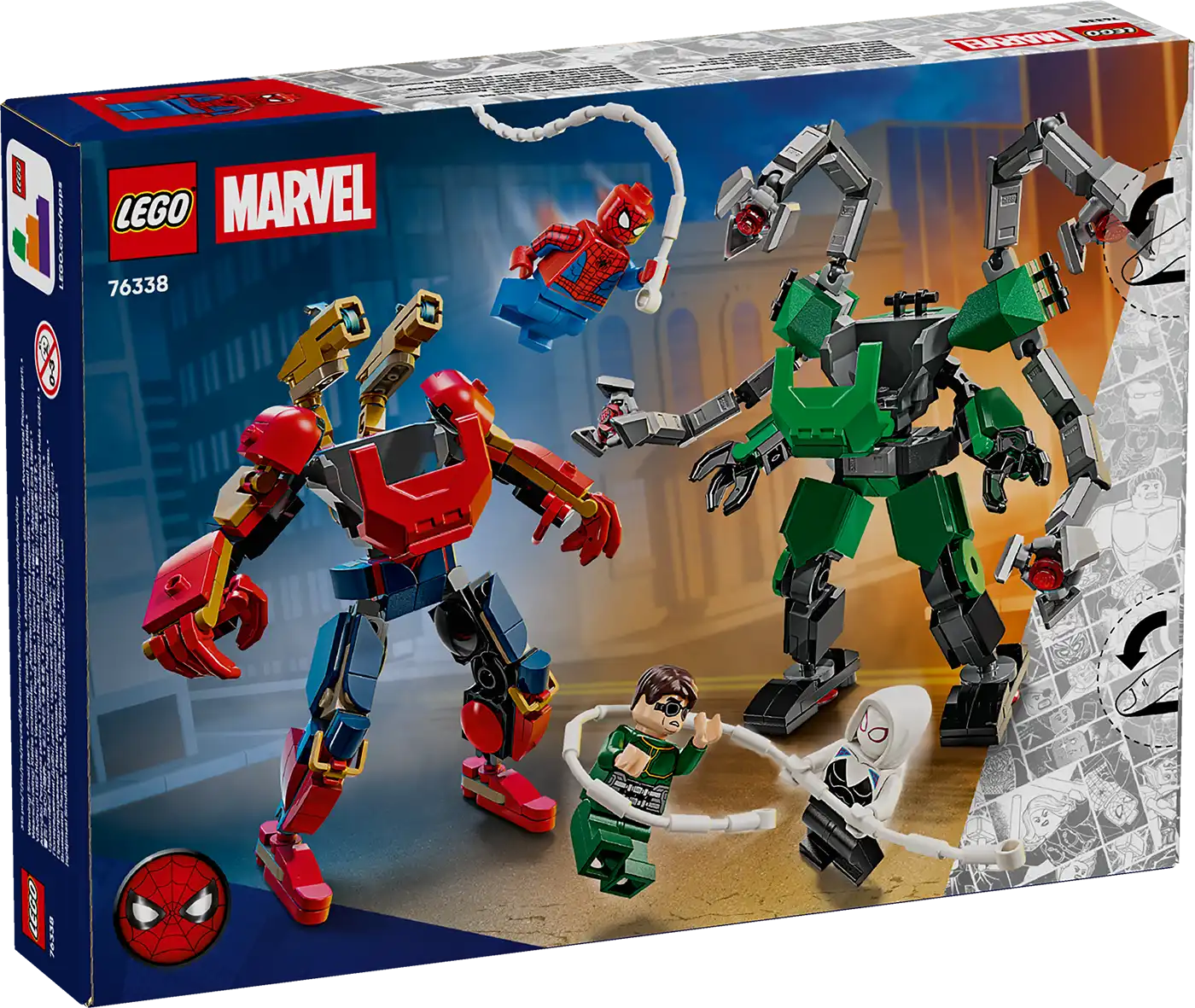 A dinamikus, eseménydús akciókat a robotok csuklós kialakítása garantálja, a felnyitható fülkékbe pedig egy-egy minifigura kerülhet. A Pókember robot Vaspók stílusát idézi, és tartozik hozzá még 2 mozgatható, gombbal működő korongvető is. A Doc Ock robot 4 csuklós kialakítású csáppal van ellátva. A szett része még 2 hálókötél is, amiket könnyedén lehet rögzíteni a robotokhoz és a minifigurákhoz, Szellempók lasszóját pedig Dock Ock törzséhez lehet rögzíteni. Ez a LEGO ǀ Marvel Pókember szett egy nagyszerű ajándék, a LEGO Builder appal pedig a gyerekek magabiztosan építhetnek, hiszen a digitális útmutatók segítségével 3D-ben felnagyítják és megforgatják a modelleket, és követik a haladásukat. Az építőkészlet 315 elemet tartalmaz.