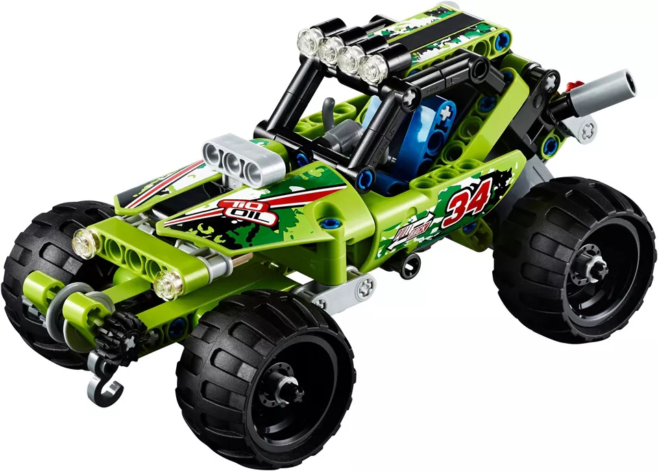 LEGO® - 42027 - LEGO Technic, Power Functions - Sivatagi versenyautó. Ez a tömzsi Sivatagi versenyautó durva terepviszonyokhoz készült. Egy hátrahúzós motor lendíti előre, és 4 masszív kerekével bármilyen akadályt legyőz. Ezen a nagyszerű kis modellen egy bukókeret is van, hogy védje a pilótát, és egy lámpasort is találsz a tetején. Egy menő csörlő is helyet kapott rajta, hogy a nehéz helyzetekből ki tudja húzni önmagát, de ferde kipufogója is van, oldalán pedig öntapadó matricák és egy rajtszám látható. A még akciódúsabb játékélmény kedvéért, kombináld modelledet a 42026-os Fekete Bajnok versenyautóval, és építs egy 2 hátrahúzós motorral felépített Versenykamiont.